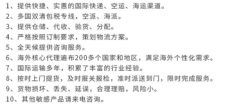 6、 报价不含目的地海关的关税、海关罚款、仓储费以及收件人不能配合所引起的退件费,如收件人拒付将自动更改为发货公司(人)支付;