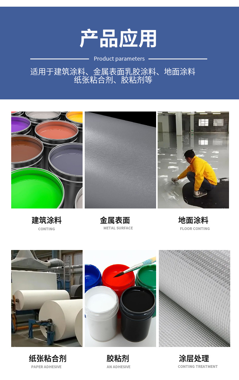 Область применения Architectural coatings, metal surface latex coatings, floor coatings, paper adhesives, adhesives