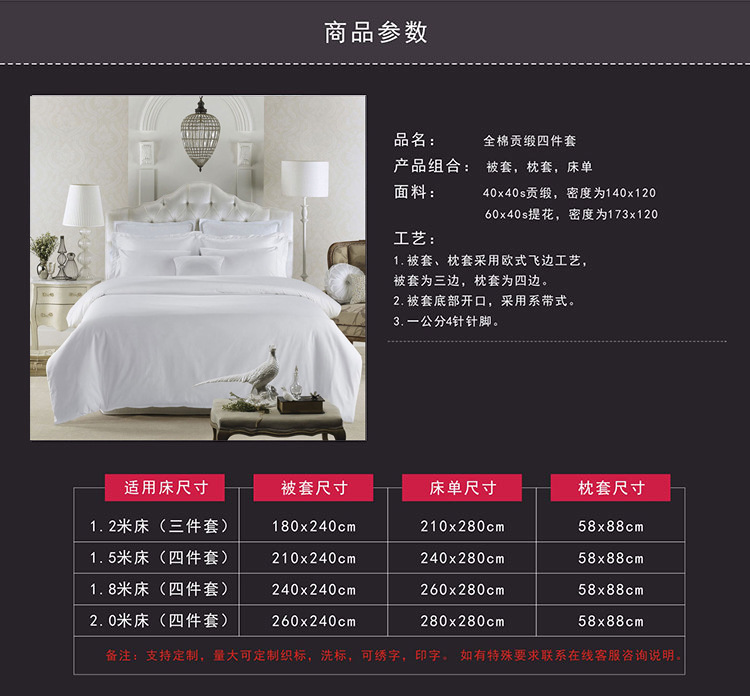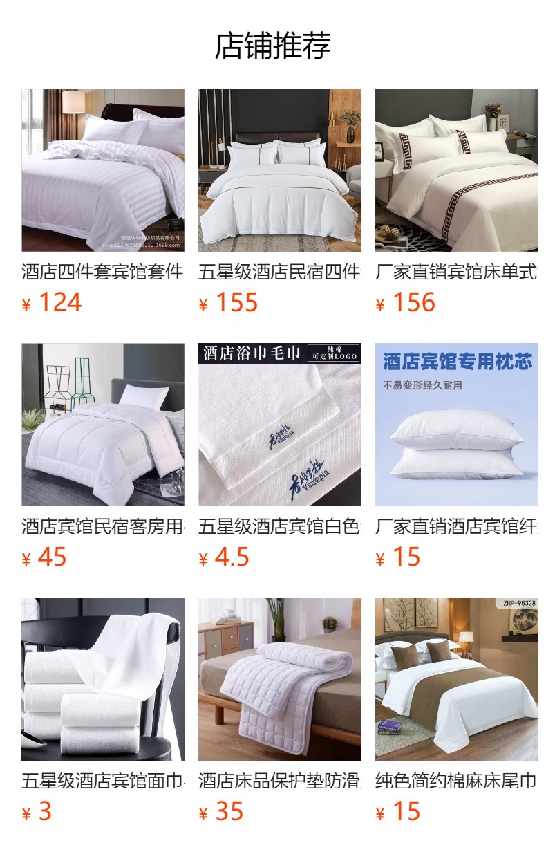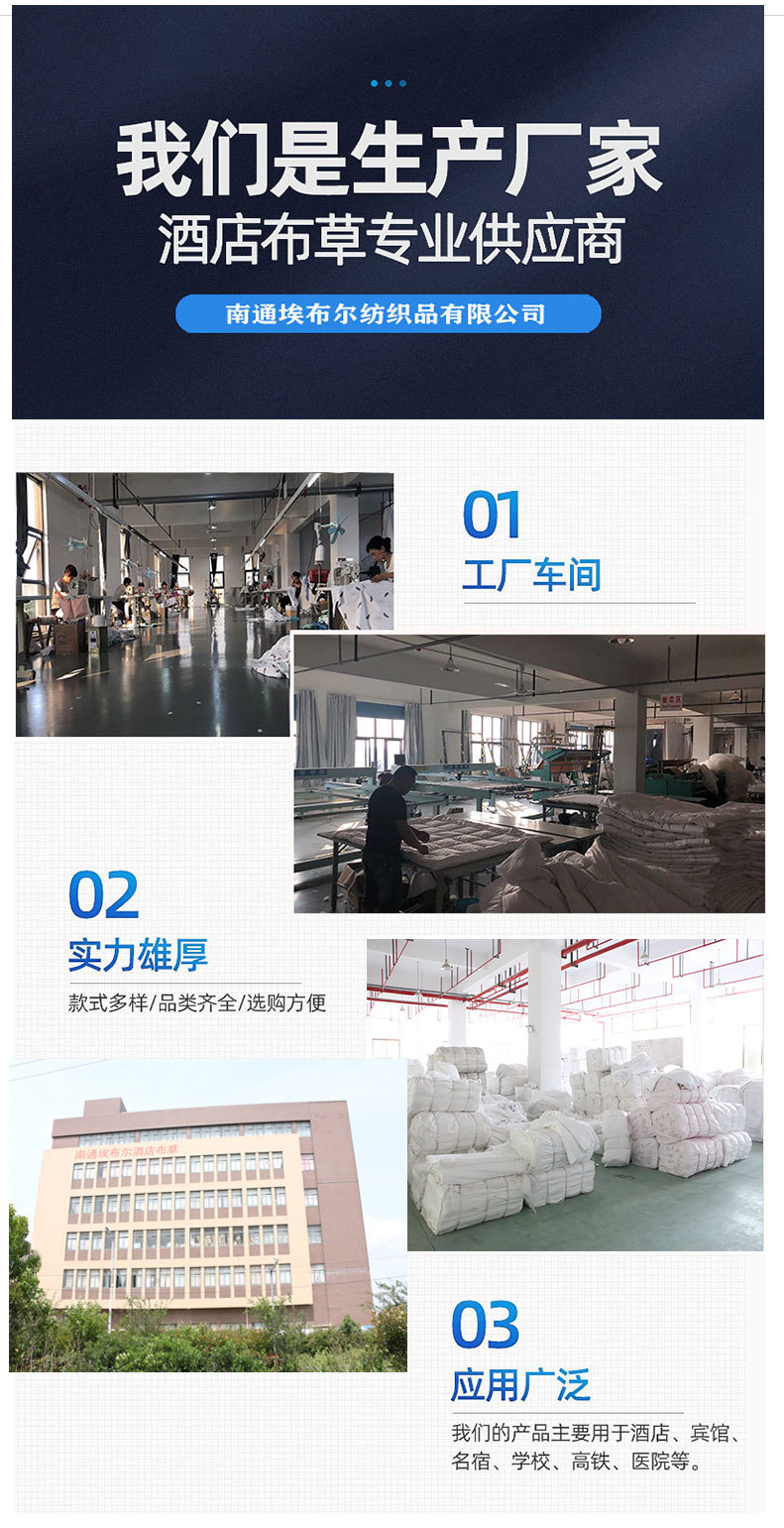 公司主营:中高端酒店,宾馆,民宿,客栈,公寓等床上用品(床单被套枕套床尾巾,被芯枕芯床护垫,毛巾浴巾地巾浴袍),床单被套枕套毛巾浴巾均可绣logo/酒店名,量大免费定制水洗唛。下单前请确认好尺寸和数量,订单确认后不得中途改动或者退款。