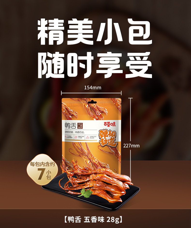 Утиный язык Baicao со вкусами (пять вкусов) 28 г, упаковка 100 пакетов, мясные закуски, тушеные, готовые к употреблению, портативная маленькая упаковка
