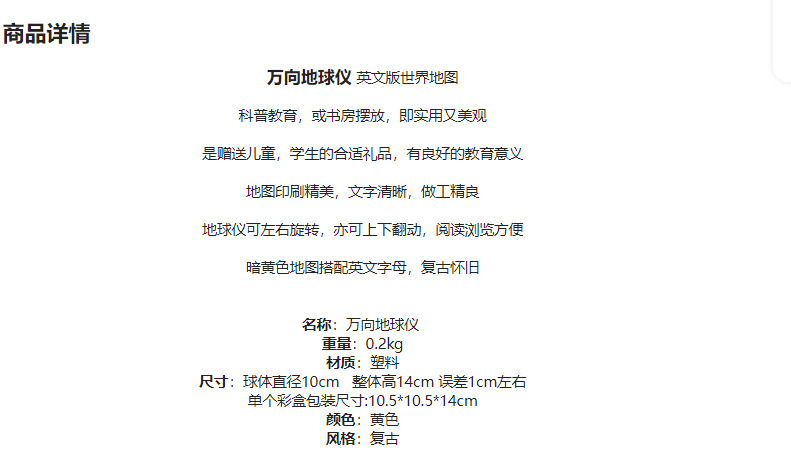 跨境英文版复古小型地球仪 塑料工艺装饰品 教学摆件万向地球仪 精美礼物