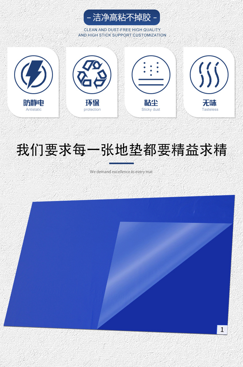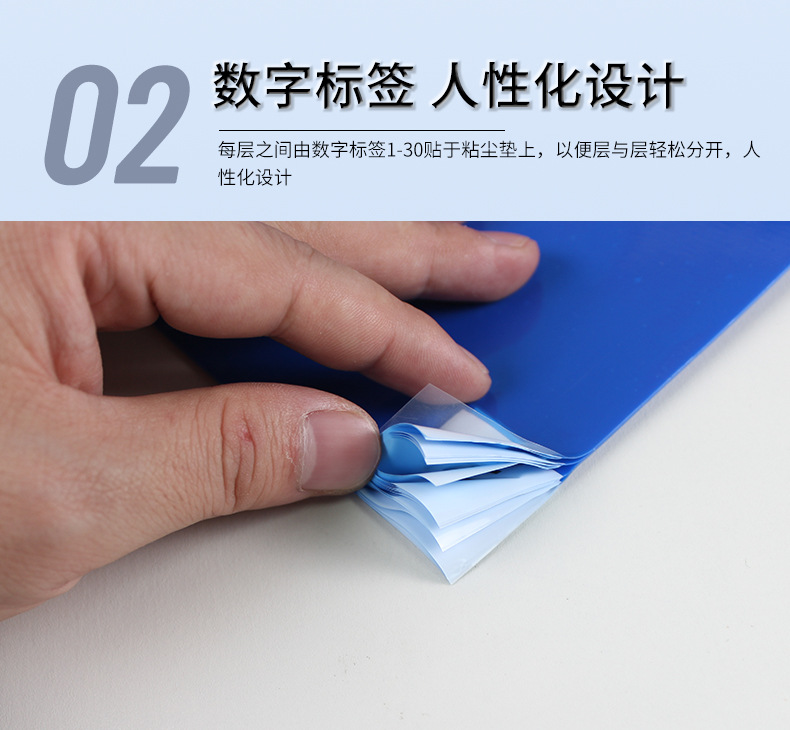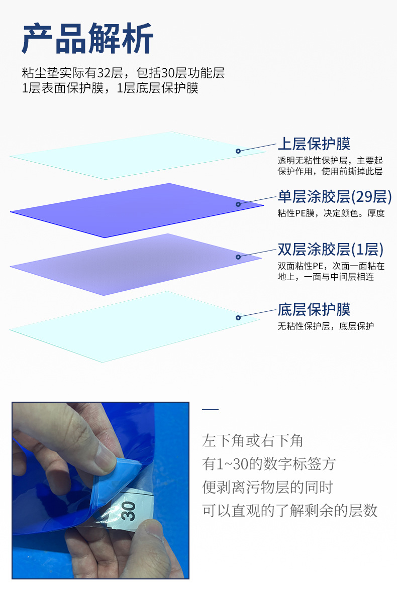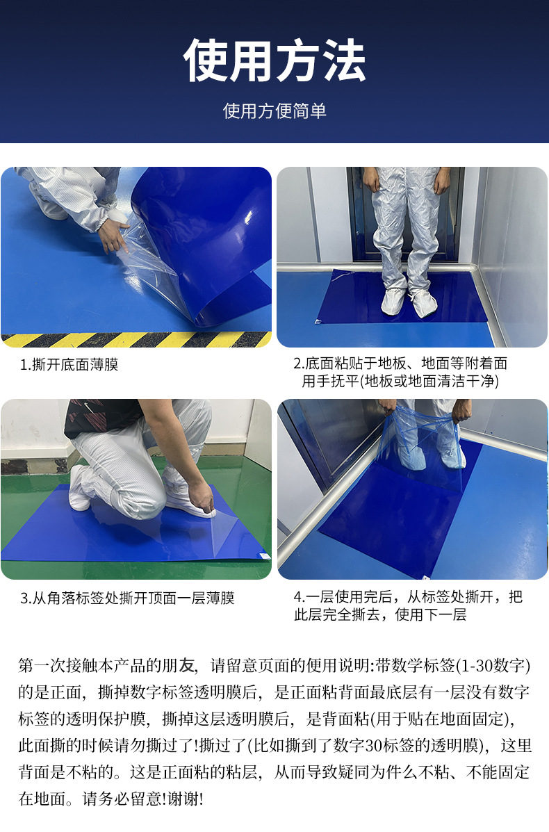 第一次接触本产品的朋友,请留意页面的使用说明:在使用粘尘垫之前,请把地面清洁干净,不能有水痕。带数字标(1-30数字)的是正面,使用时需先找到数字30背面的保护膜并把保护膜撕掉粘贴到地上贴平整【请一定一定注意:不能把数字30撕掉,撕掉了就没办法粘贴了】