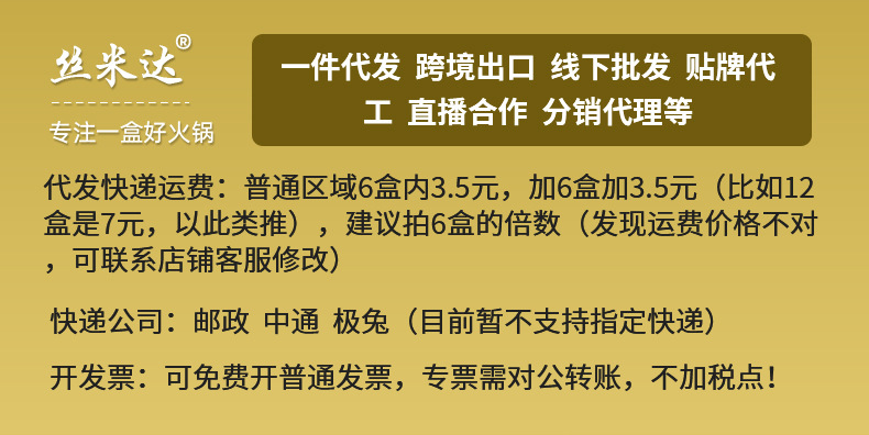 重庆丝米达食品有限公司位于重庆市江津区德感工业园区东江路555号,自热火锅源头工厂,专业个性定制,30000万平工厂,日生产量达15万盒,48小时快速发货,日发货量5万PCS,线下铺货商超:永辉超市、大润发超市等500家线下铺货商超,专业生产、研发、代工重庆自热火锅、自热酸辣粉、自热米饭等系列重庆特色产品,欢迎全国各地老板洽谈合作、实地考察,我们来给您品质的保证!关于快递,快递随机,自热火锅是6盒以内3元运费,6-12盒是6元运费,依次类推,新疆/西藏15元/公斤,具体可咨询客服~~ 丝米达自热火锅方便米饭煲仔饭重庆酸辣粉自煮懒人自助小火锅即食速食食品螺狮粉批发麻辣牛油底料