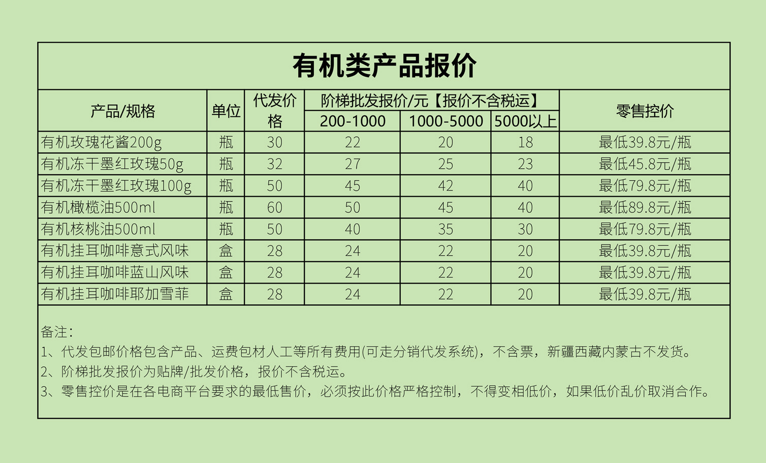 【古训】品牌的所有有机产品实行严格控价,500g有机糖零售价≥32元,250g瓶装和220g盒装零售价≥20元,为维护各级分销商利益,望大家严格遵守,如有乱价的一经发现将拒绝供货取消合作,如果介意控价的,可以联系在线客服,我们支持小批量定制贴牌。