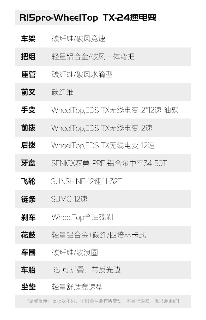 【变速】:WheelTop轮峰,EDS TX无线电变-2*12速 油碟