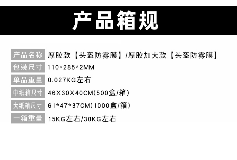 ![]() | (chinese boxed) | Thick glue plus size [1 piece anti-fog + 1 piece rainproof] 2 pieces in total | ¥5.0 / ≈ 60 ₽ | 9999 | 6066515819522 | |