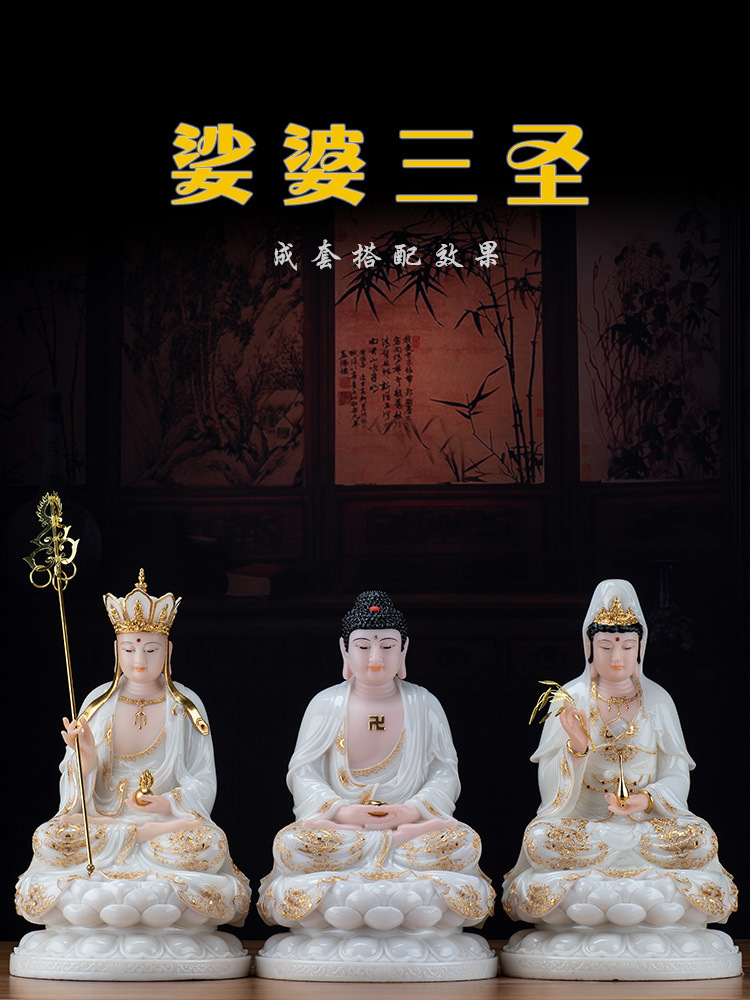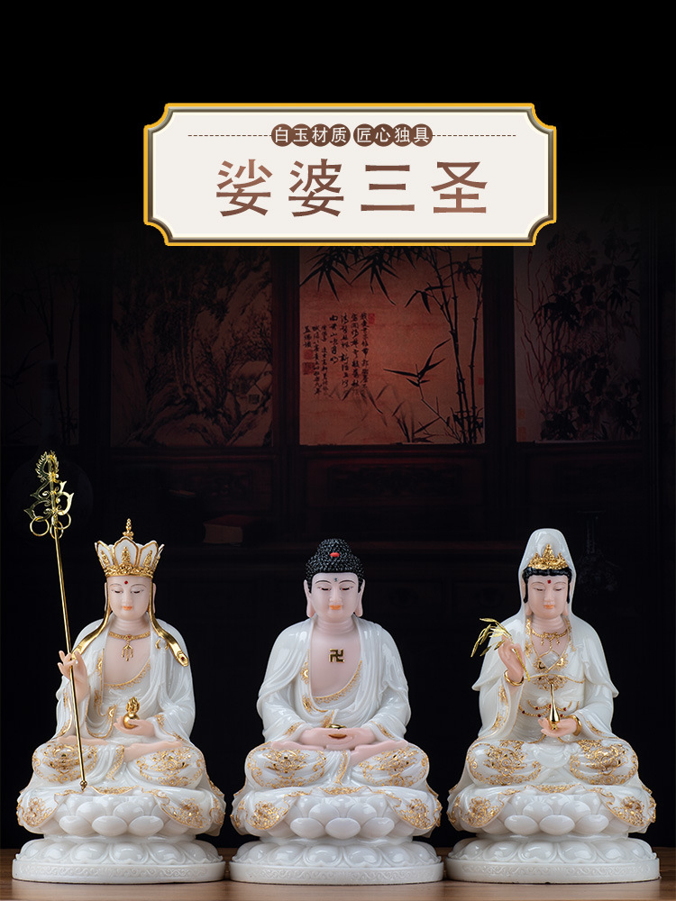 Белая мраморная резьба с золотой инкрустацией Ксизанг короля Гуаньинь Бодхисаттвы Сакьямуни Сакьямуни Сакха три святых Будды украшения для дома