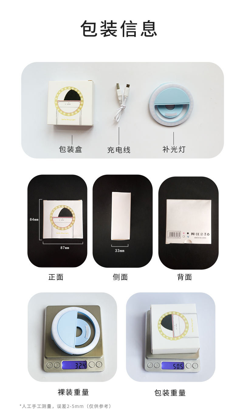 产品清单:补光灯、usb充电线、彩盒灯具功率:3w,环保焊锡