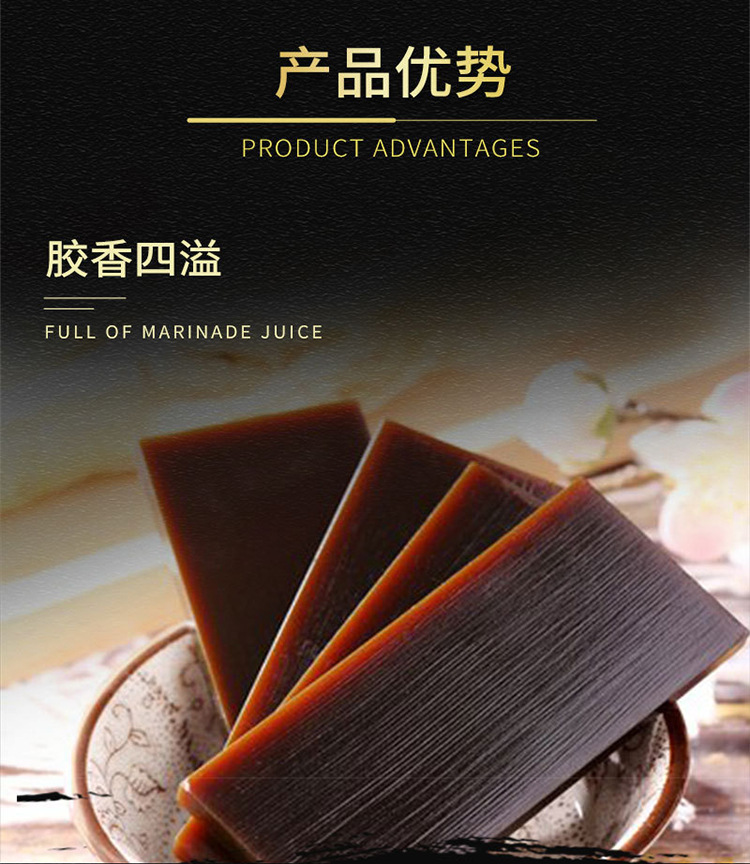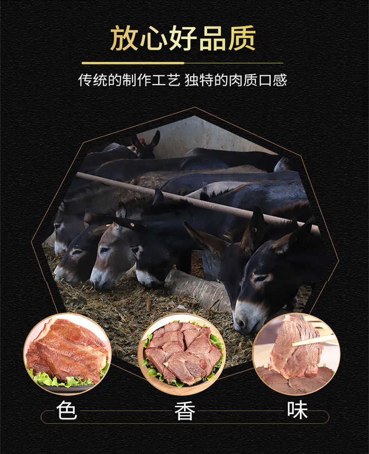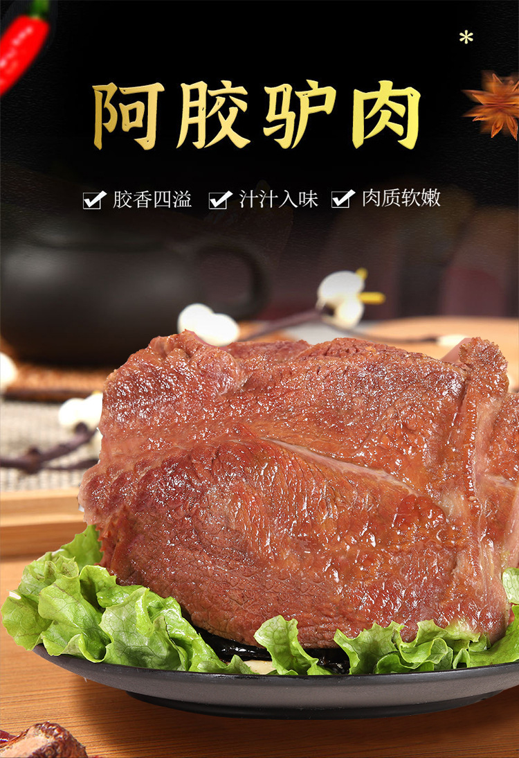 Сырьё и ингредиенты Donkey meat, edible salt, brewed soy sauce, white sugar, soy protein isolate, starch, msg, spices, donkey hide gelatin, cooking wine...etc