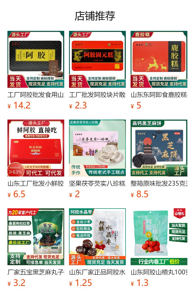 ![]() | 200g donkey-hide gelatin deer meat | ¥15.3 / ≈ 185 ₽ | 0 | 5269562788434 | |