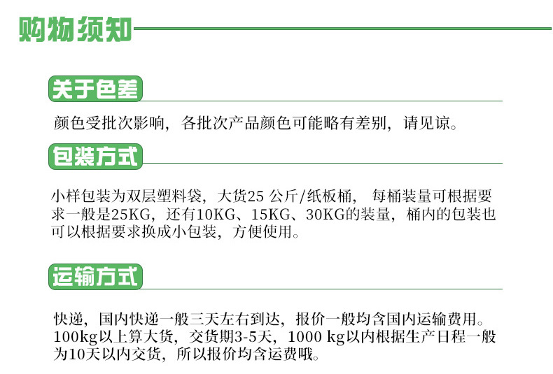 【产品包装】:1kg/双层自封袋;25kg/纸板桶(或根据客户要求包装)