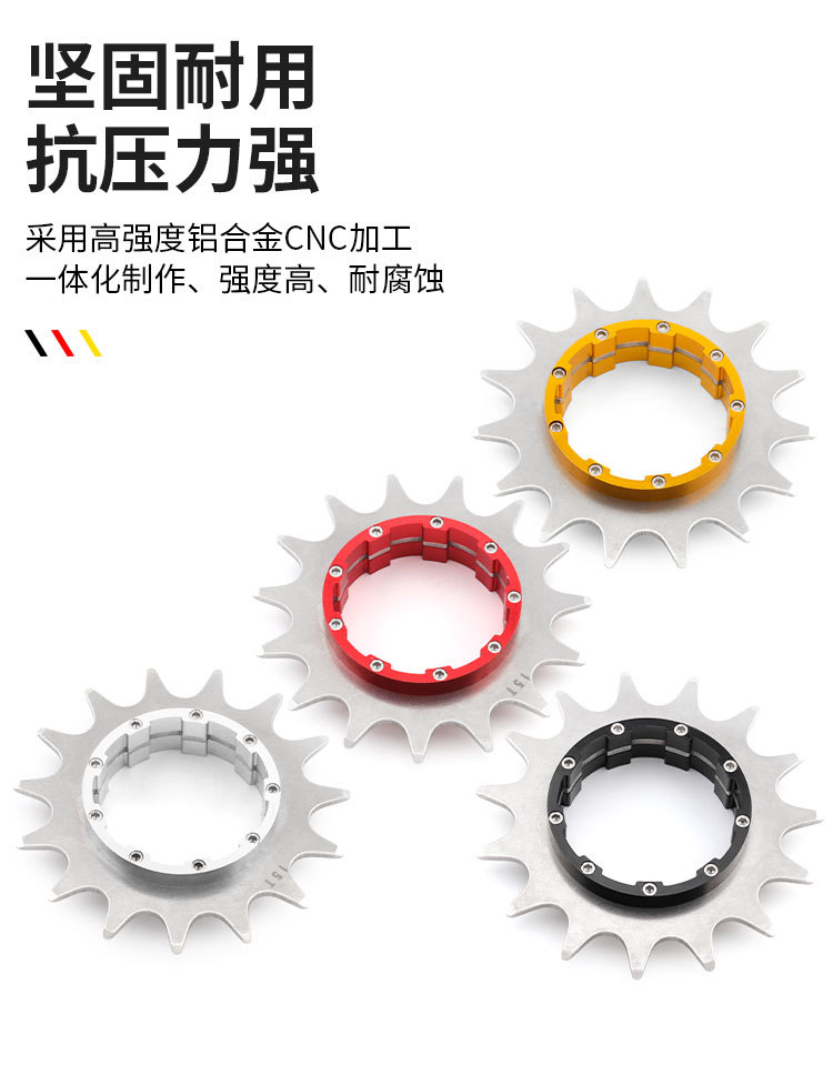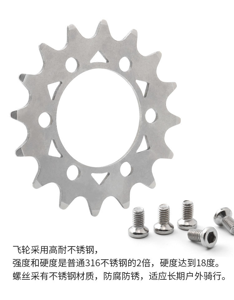 飞轮采用高耐不锈钢,强度和硬度是普通316不锈钢的2倍,硬度达到18度。螺丝采有不锈钢材质,防腐防锈,适应长期户外骑行。