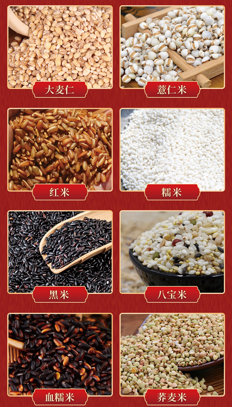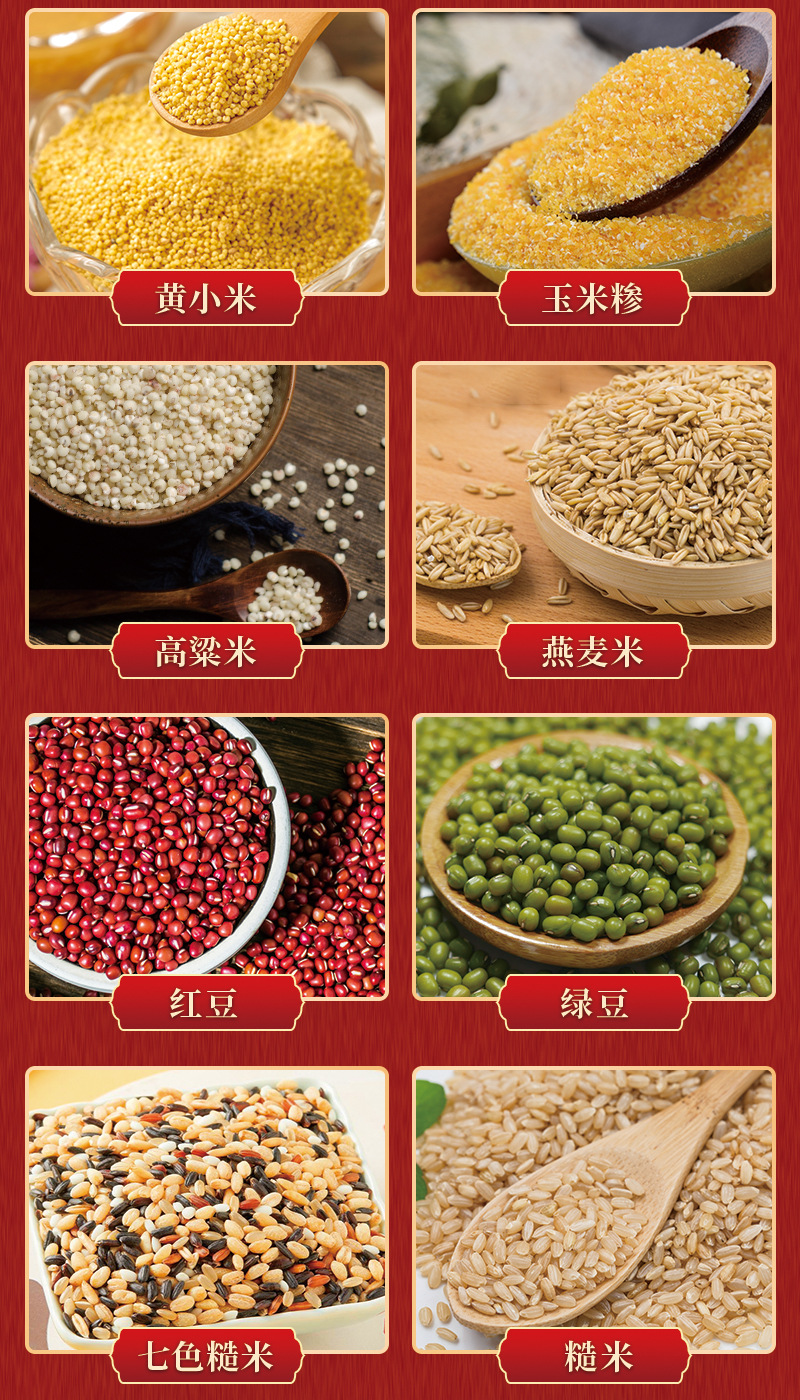 Сырьё и ингредиенты Green beans, millet, glutinous rice, black rice, rice, brown rice, buckwheat, oatmeal, sorghum, barley kernels