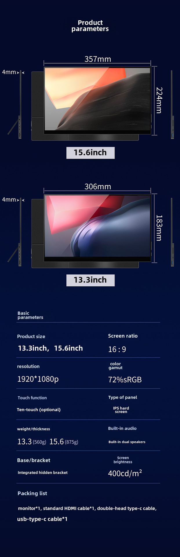 Список упаковки Monitor*1 hdHDMIcable*1 type-c cable*1 usb-type-c cable*1 power adapter*1