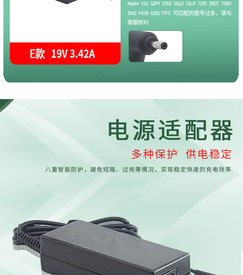 Подходит для Acer, блок питания для ноутбука 65W, адаптер 52PY 57E8 51QJ 53LR 7185 55DT