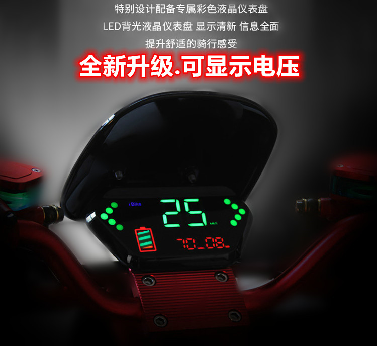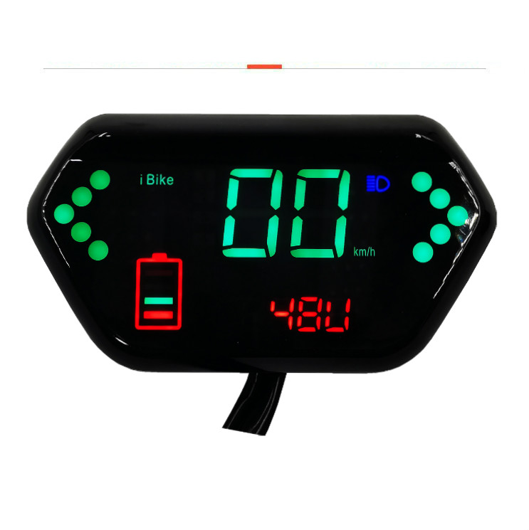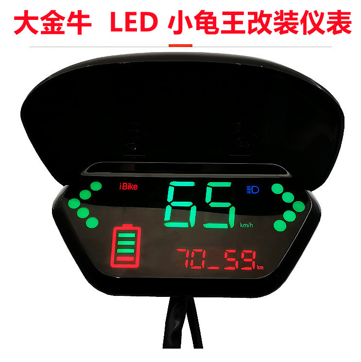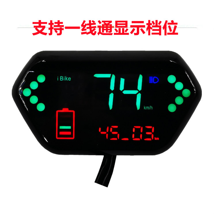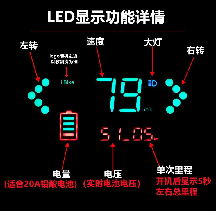 液晶为LED灯珠,仪表显示功能6种:电量显示、速度显示、先总后单里程显示、左转显示、右转显示、大灯显示(档位显示说明,我们的仪表有预留一线通,一部分客户可以用一线通来显示档位,并非每一个买家都能显示)里程:先总后单,开机后显示5秒左右总里程
