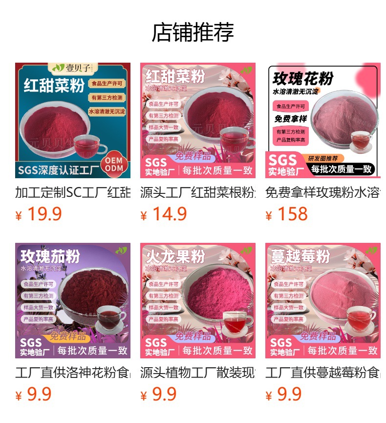 ![]() | 100g red beet powder (multiple bags not split) | ¥14.9 / ≈ 176 ₽ | 9728 | 5817677666458 | |
