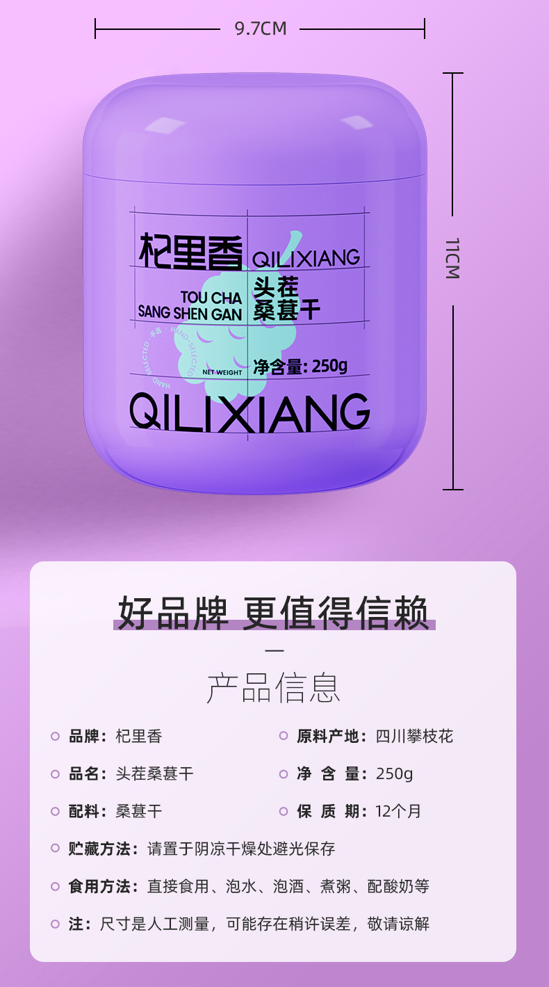 ![]() | Qilixiang selected dried mulberries 250g | ¥10.0 / ≈ 120 ₽ | 99730 | 5072309464143 | |