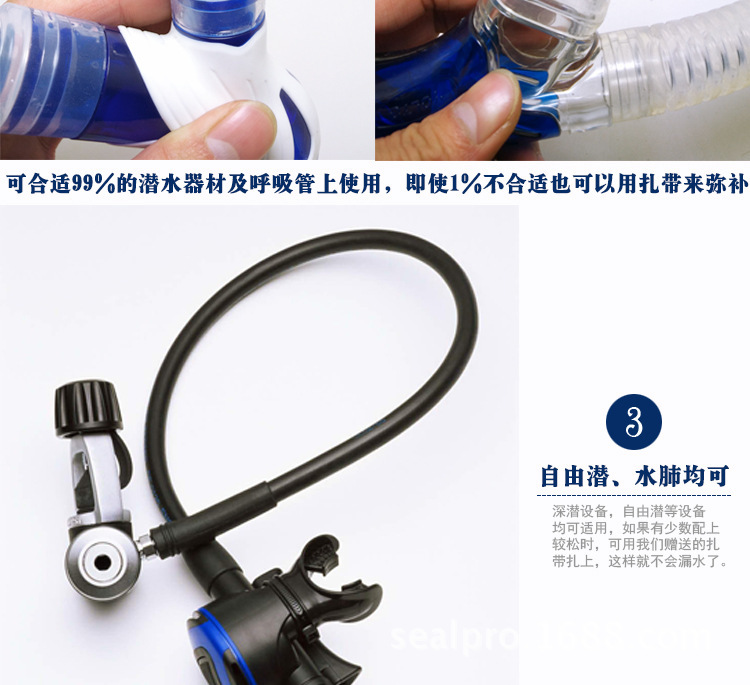使用范围:浮潜全干式管、水肺二级头、标准通用口径。