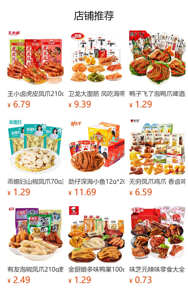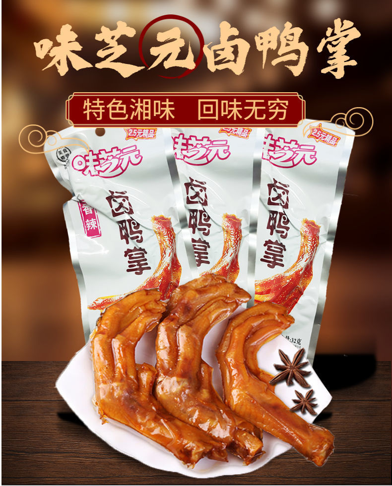 ![]() | Weizhiyuan [braised duck feet] 32g (single bag) | ¥1.99 / ≈ 24 ₽ | 2001 | 5954047651976 | |