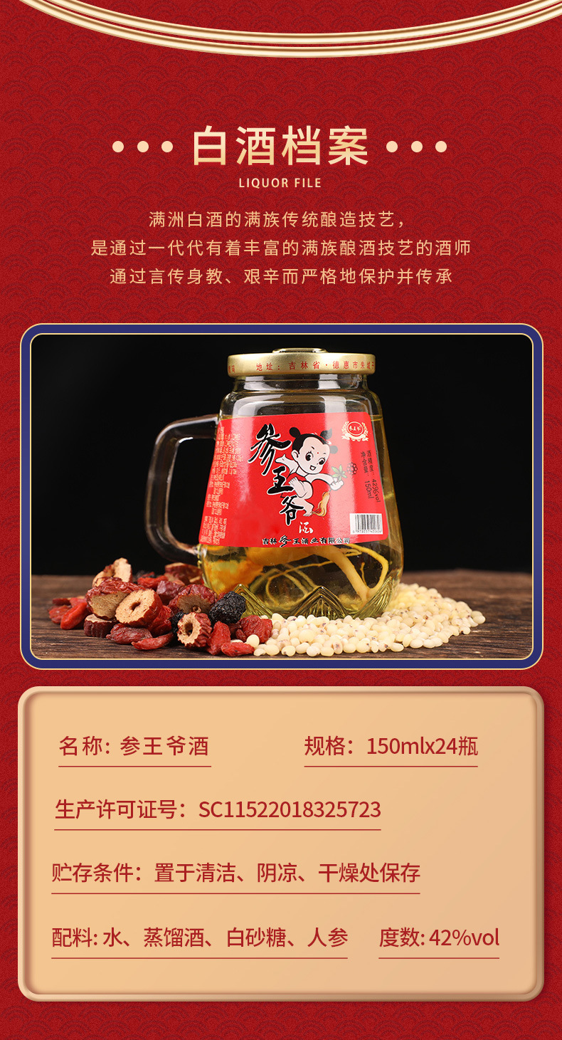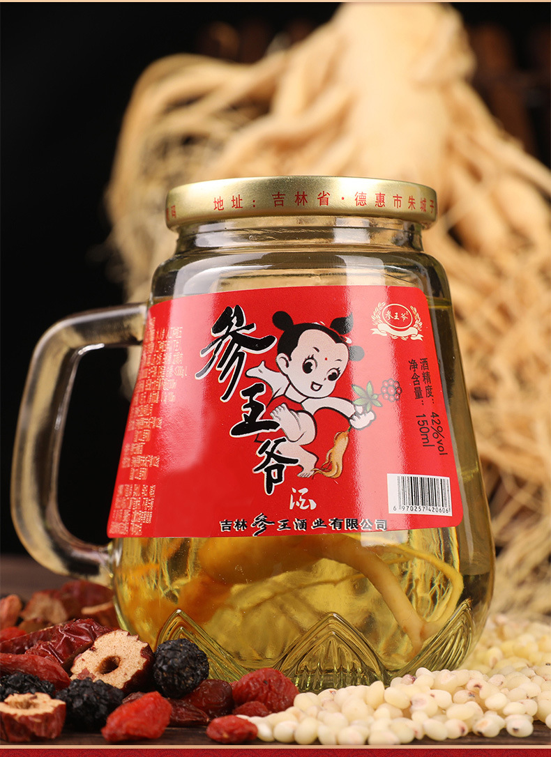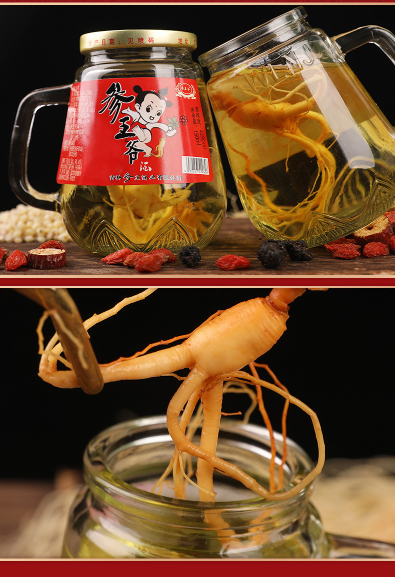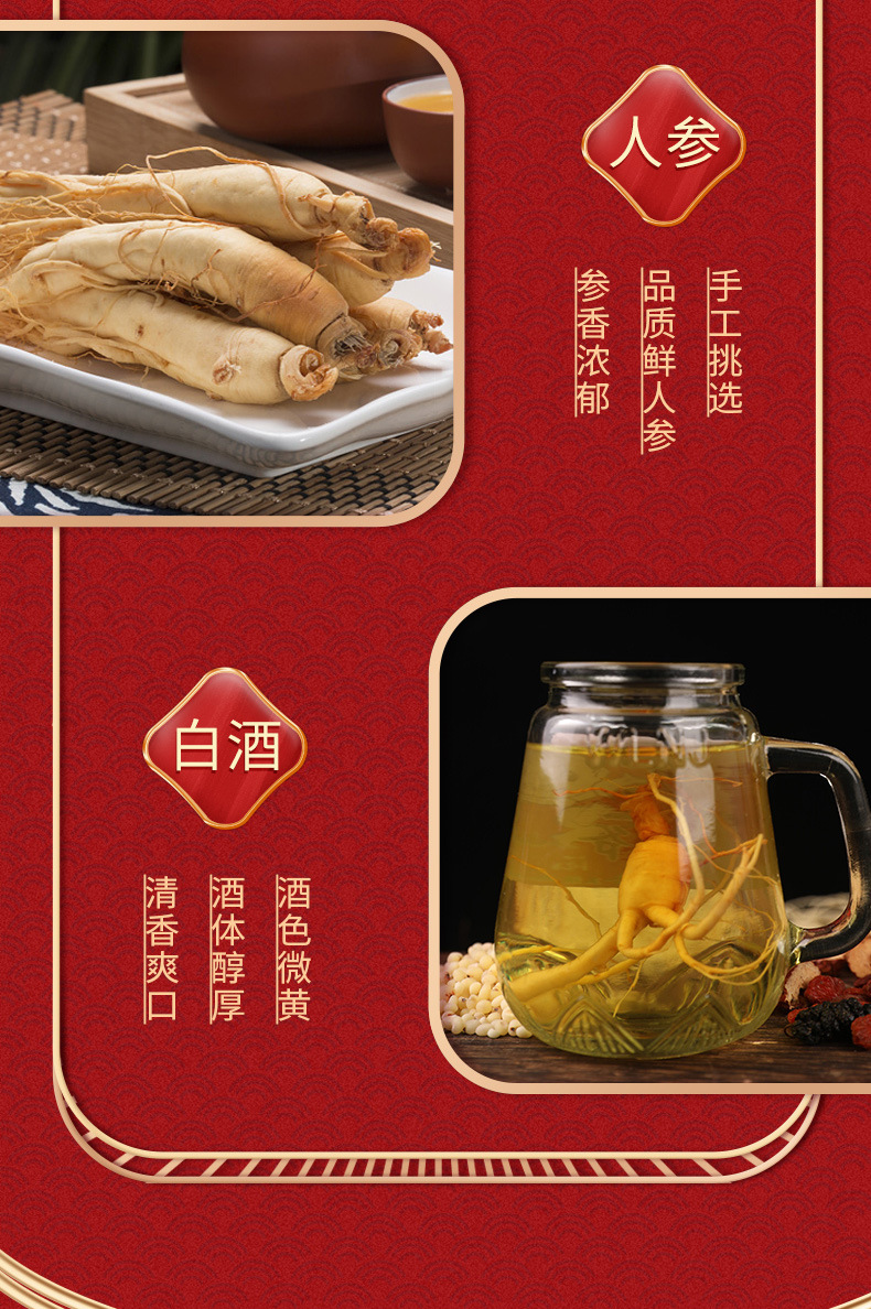 Сырьё и ингредиенты Sorghum wine (distilled wine), water, ginseng (ginseng planted for four or five years) or fresh garden ginseng (artificial planting for five years)