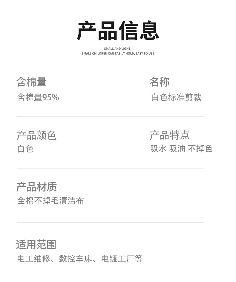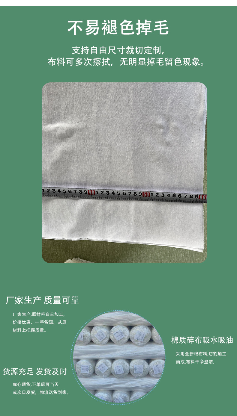 购买前请咨询客服! 谢谢合作!讲究手感舒适,吸水吸油性好,耐磨性强,不掉毛不褪色。是您生产清洁和产品养护的理想选择。