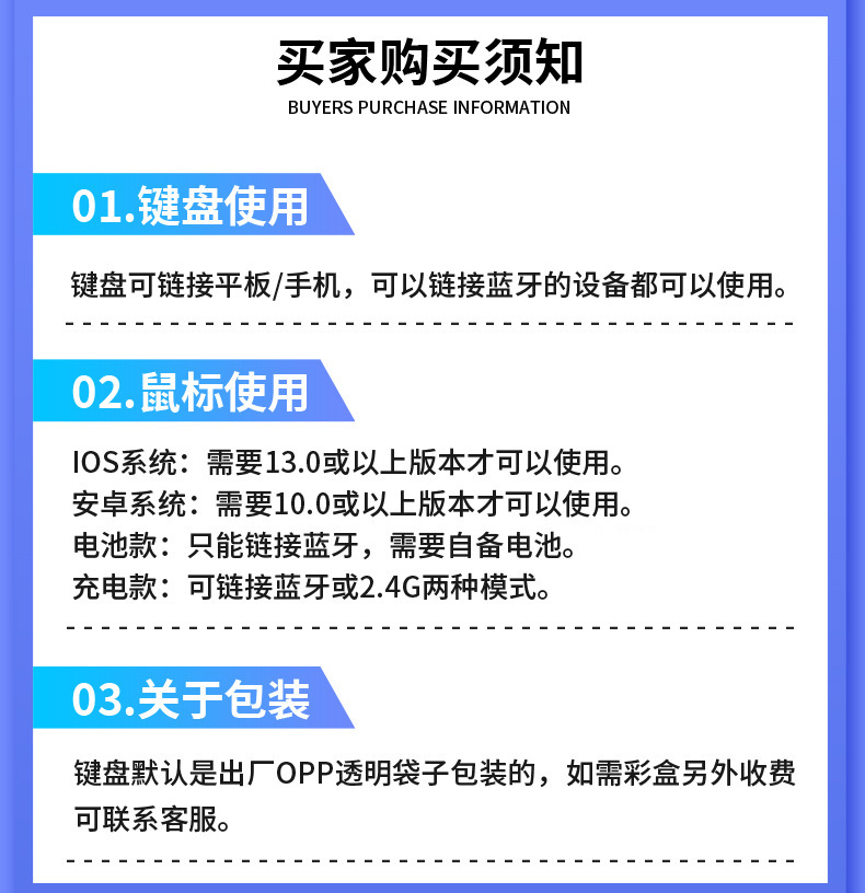 ![]() | 10-inch rechargeable keyboard + battery single-mode mouse | Sky blue [free charging cable] | ¥23.0 / ≈ 278 ₽ | 9622 | 5766716433106 | |