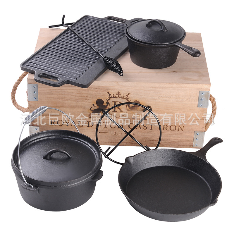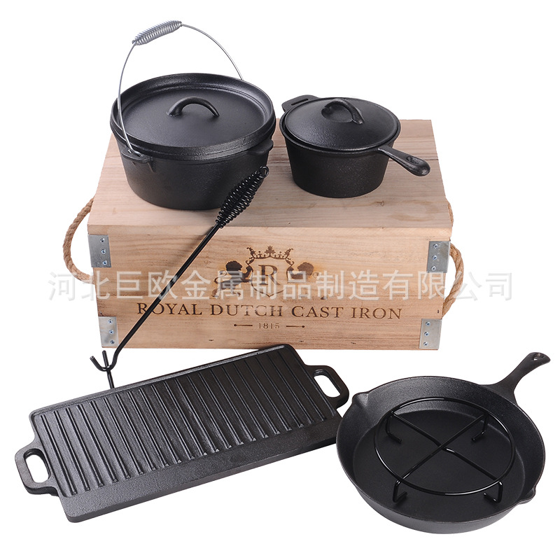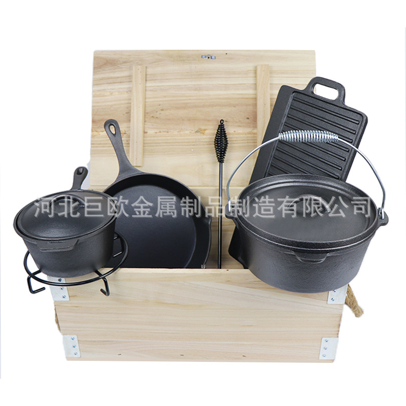 Набор кастрюль для кемпинга, чугунная кастрюля, чугунная голландская кастрюля, деревянный ящик, набор посуды для пикника