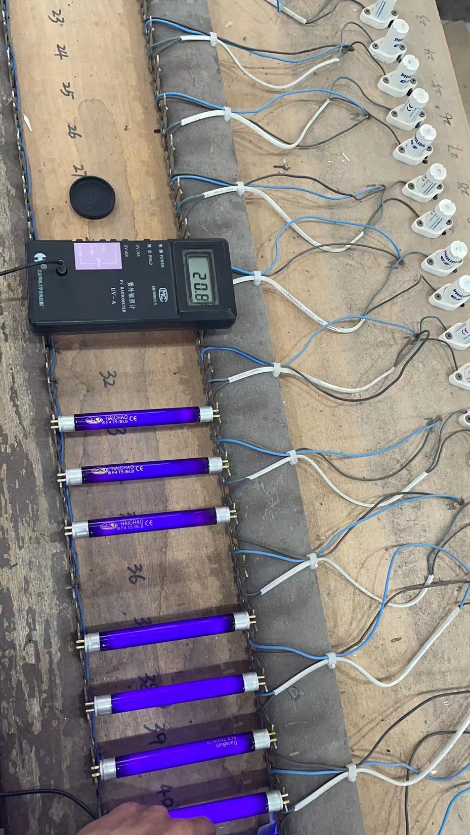 工作原理: 紫光管的工作原理和普通照明用荧光灯相同,其差异仅在于,紫光灯管所使用的荧光粉在254nm短波紫外线辐射激发下产生主峰为365nm的不可见的长波紫外线辐射。由于使用玻璃管不同,可分为两大类。一类是使用不透可见光的紫黑玻璃管,这类灯管发出的主峰为365nm的近紫外线辐射,波长范围为300-400nm。另一类使用普通玻璃管(即:普通黑光灯),其发出的辐射中除了365nm的长波辐射外,还有400nm附近的可见蓝光.后一种灯的应用范围较小,大都用于诱虫。