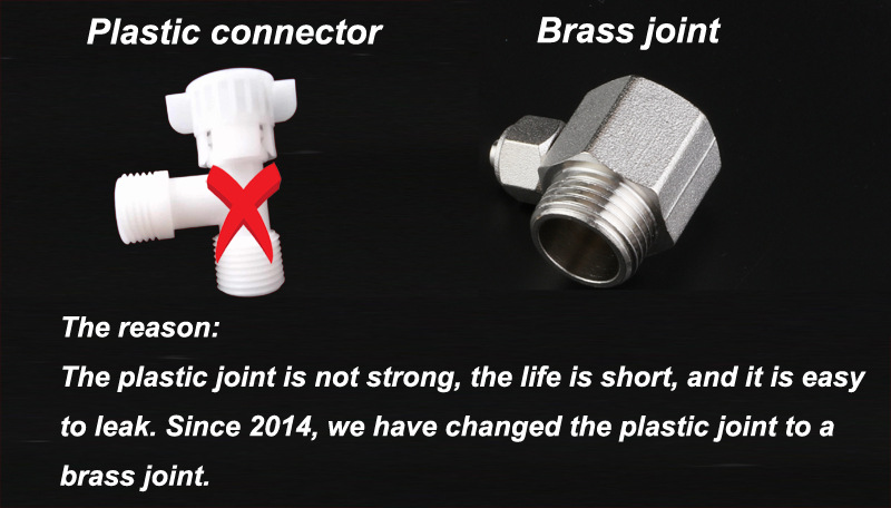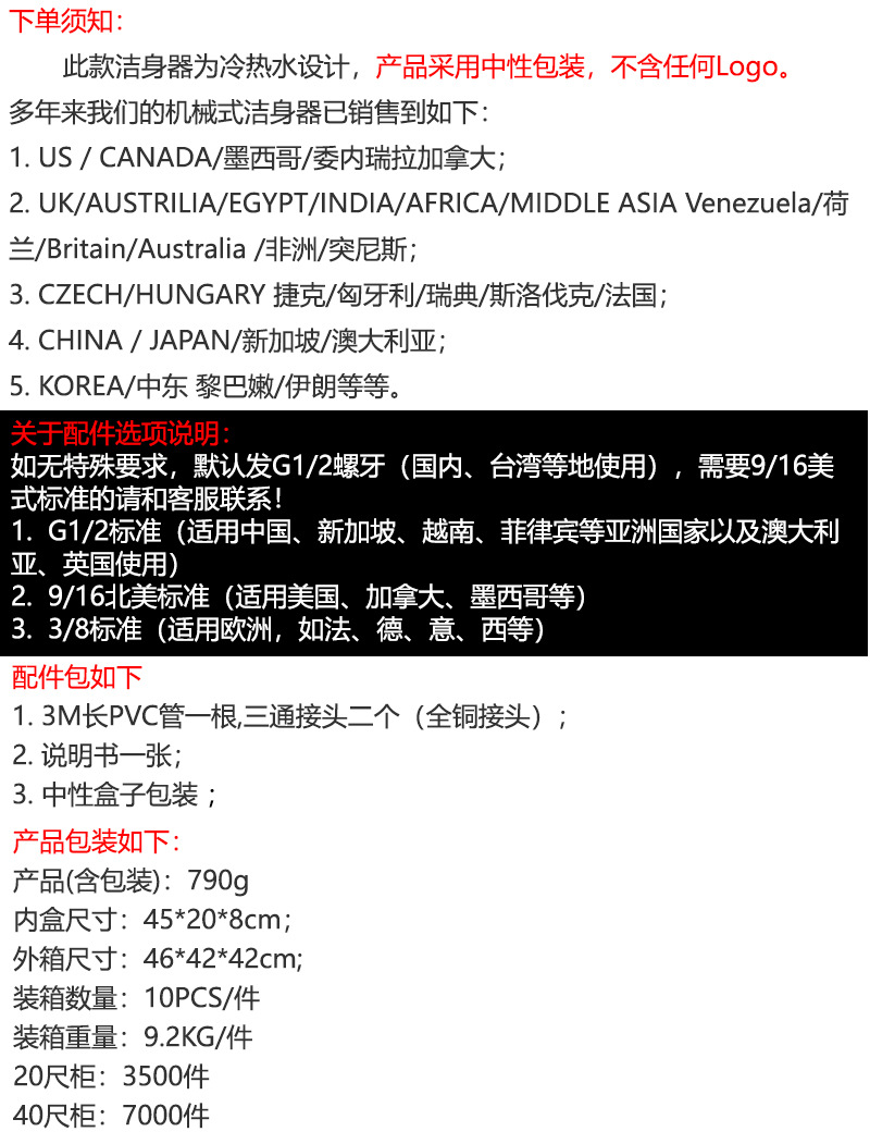 因塑料接头使用寿命不够稳定,我司从2014年年底,针对所有出口洁身器的接头全部更改为全铜接头(标准配置)。
