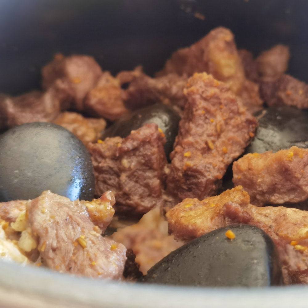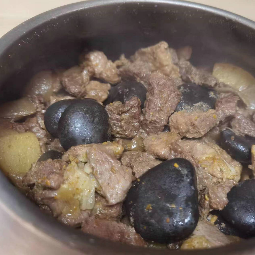 打开盖的那一时刻,空气中都弥漫着羊肉的香味。羊肉外焦里嫩,土豆软糯干香,红萝卜晶莹剔透。真是色香味俱全。降温后放在盘中,盼望已久的大餐终于可以开始享用。肉嚼在嘴里鲜嫩多汁,肥而不腻,土豆和红萝卜充分吸收羊肉香味,美味可口。再来一杯马奶酒真是绝配。