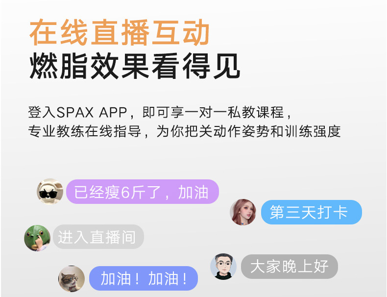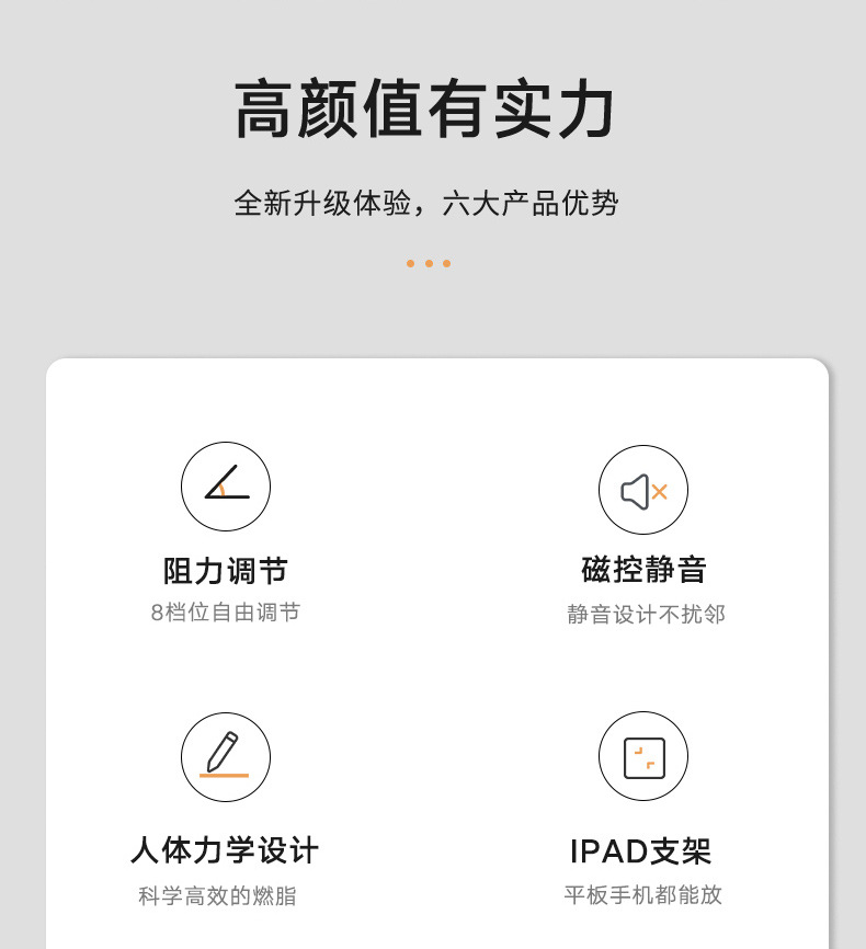 蓝牙:APP游戏 带ipad支架 电子表:心率、时间、速度、卡路里、里程、转速(选配) 皮带盘:一体成型皮带盘 皮带: PK加厚静音皮带 脚踏:加大ABS脚踏 扶手:泡棉扶手 坐垫:超软加大坐垫 机壳:ABS环保双面保护罩 滚轮:牛筋耐磨带轴承更顺滑 管材厚度:主件2.0管材 漆面:抛光/酸洗/磷化后 汽车烤漆工艺 优质管材:Q195 /钣金Q235 飞轮阻力:18-25KG 传动比5:1 飞轮:3KG磁控飞轮 飞轮护罩:安全双面ABS韧性高 稳定性: 高级 阻力:8档微调磁控阻力 滑轨:铝合金滑轨长度1米 |