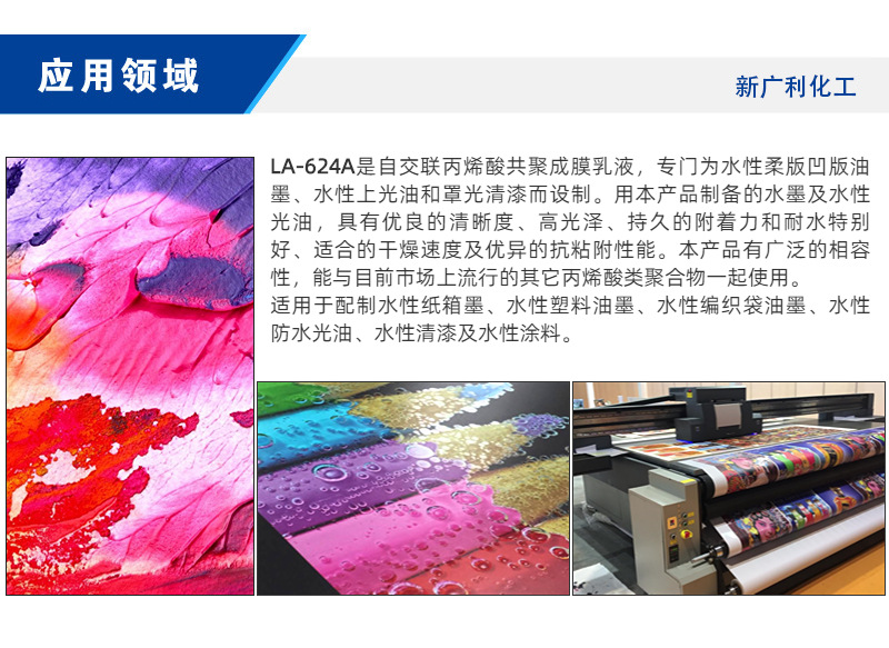 Область применения Suitable for preparing water-based carton ink, water-based plastic ink, water-based woven bag ink, water-based waterproof varnish, water-based varnish and water-based coatings.