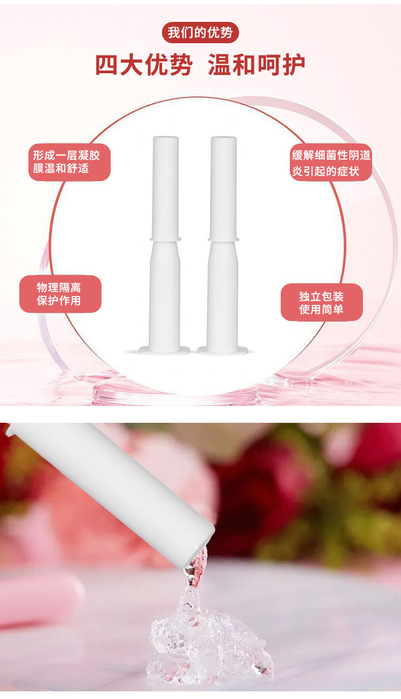 Эффективность By forming a gel film on the vaginal wall, the vaginal wall is physically isolated from external bacteria, relieving symptoms caused by bacterial vaginosis and candida vaginosis
