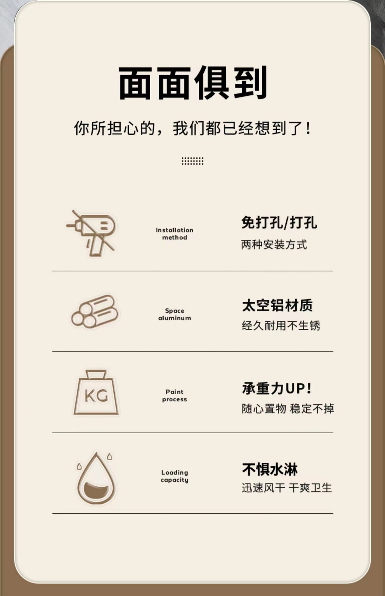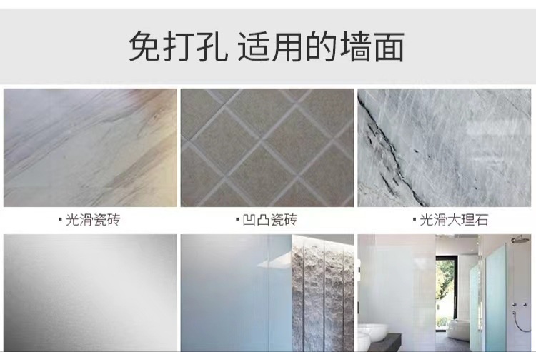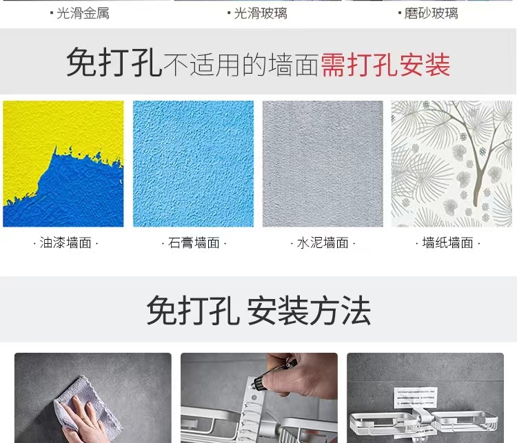 (2)、安装请注意,安装前请看视频和商品详情页,免打孔安装的墙面需是平整坚固的玻璃瓷砖等,不可用在粉刷墙、墙纸、石灰墙等不平整不坚固的墙面上(打孔安装除外)。涂胶上墙后需等待3-5天,免钉胶完全干透再使用!(不正确安装没有十年掉落理赔保障哦!)