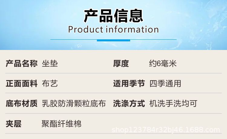 ![]() | Sea Blue Rhyme | 40*40cm suitable for student Chair/small dining chair/two corner straps | ¥2.5 / ≈ 30 ₽ | 4993 | 5869858131251 | |