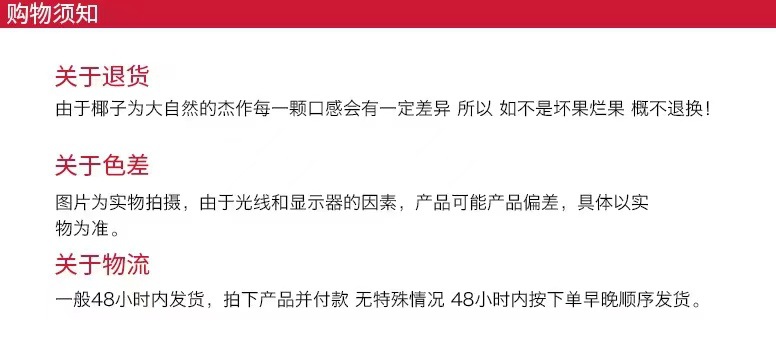 2、关于卖相:椰子是比较重比较硬的水果,由于运输过程路途颠簸及不可抗力原因造成的椰子表皮凹凸不平属于正常现象,有个别椰子有点黑皮,那是太阳照晒的结果,均不属于质量问题。