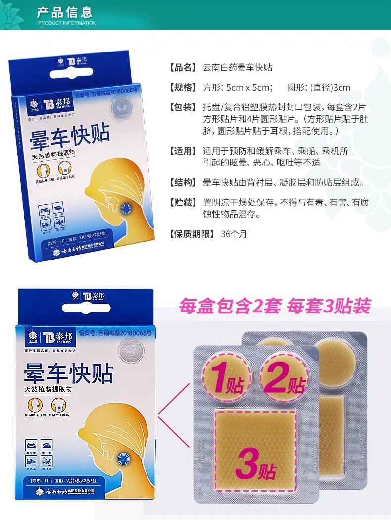 Пластыри от укачивания Taibang Yunnan Baiyao 6 шт для пожилых и студентов в дорогу