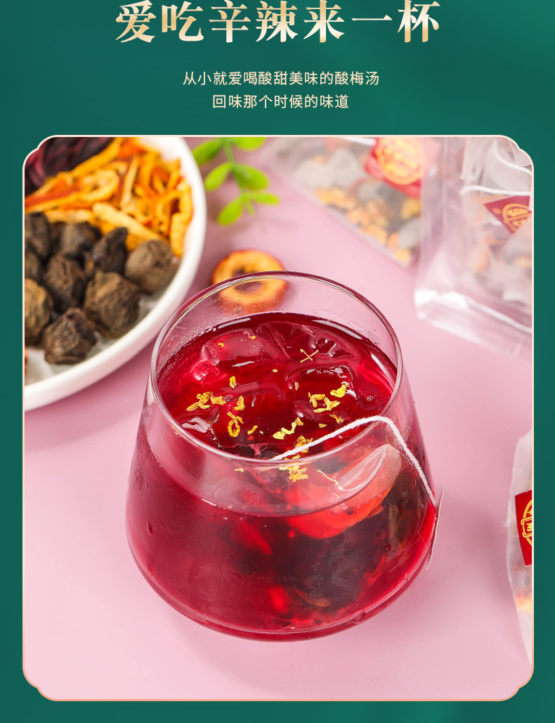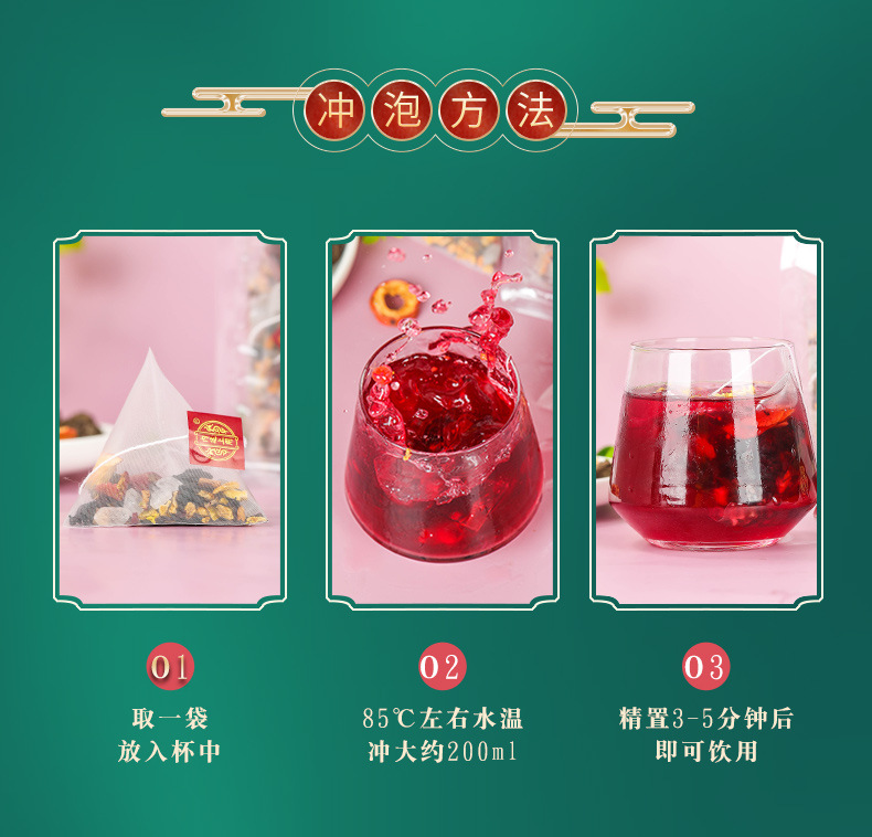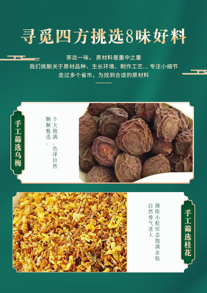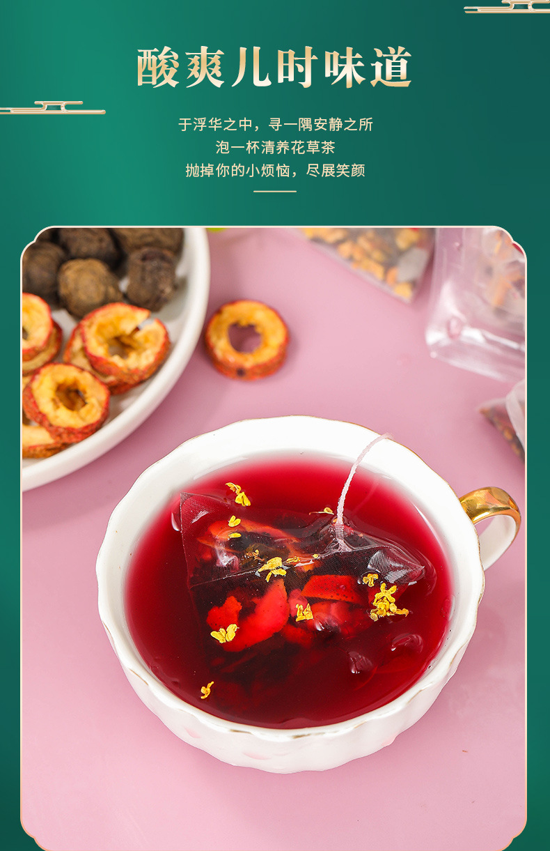 Сырьё и ингредиенты Rock sugar, hawthorn, rose, orange peel, mulberry, black plum, edible osmanthus, green tea
