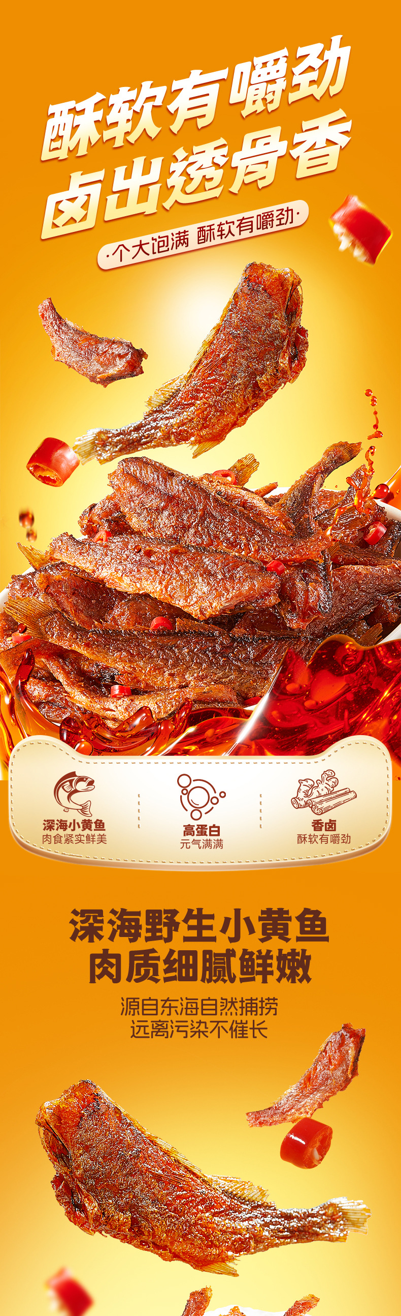 Сырьё и ингредиенты Croaker, vegetable oil, white sugar, edible salt, monosodium glutamate, brewed soy sauce, food additives (D-sodium erythorbate), spices, food essence