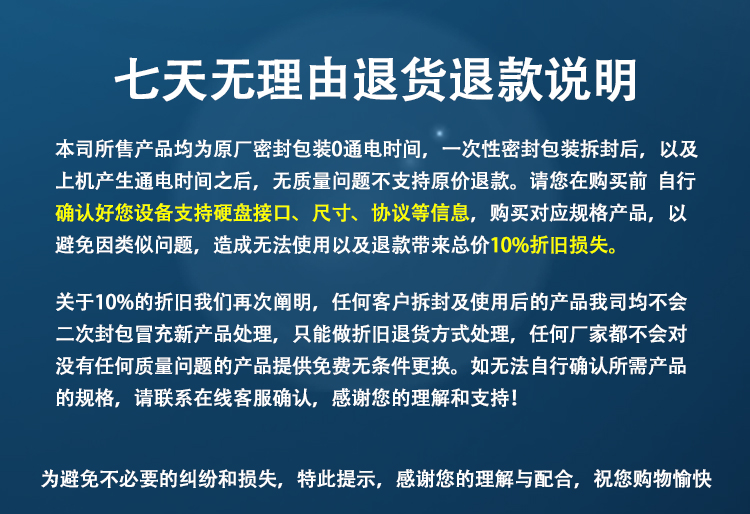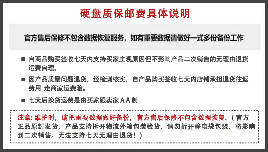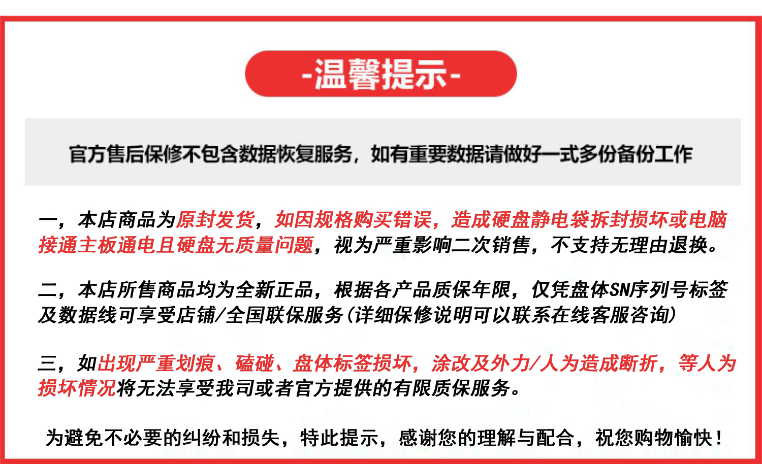 硬盘出厂日期不同,有些是21年左右的有些是新日期,有些盘属于机房测试会有测试时间,每个盘的测试时间和测试次数不同,下单默认随机发货.如有特殊要求请联系客服,签收之后1周内可以退换,超出1周时间的可以维修或者更换,不可以退,请理解! 关于质保:拆机库存盘不支持查序列号,正常使用出现故障,我们店铺负责质保,质保时间一般是签收当天开始计算2年期限。全新盘一般质保3年,部分产品质保5年,下单请于客服沟通。