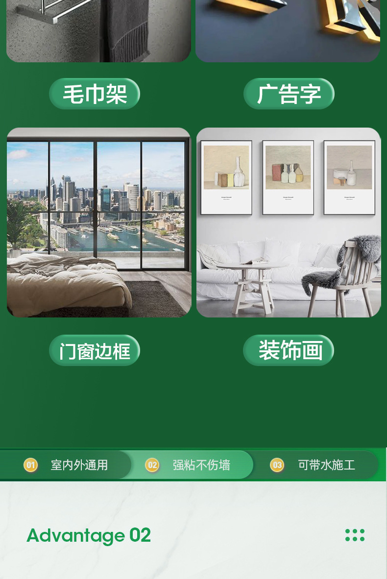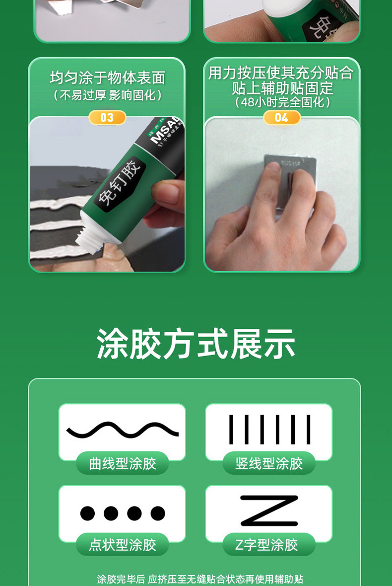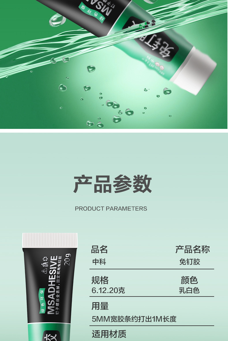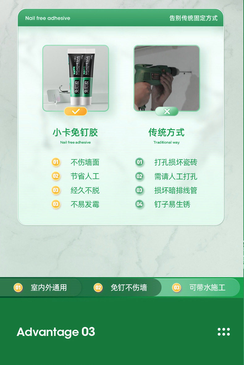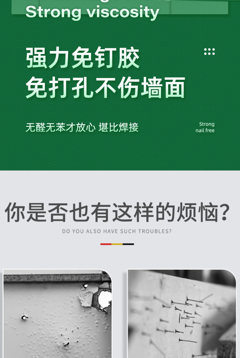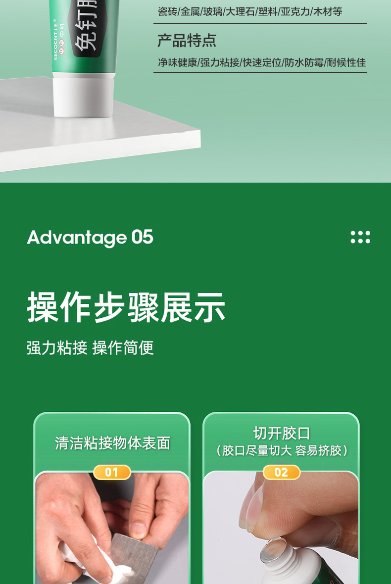 Сильная адгезия The nail-free glue has a high bonding strength after curing, and even surpasses the fixing strength of iron nailsIn the production of cabinets, after using nail-free glue, metal parts and wooden structures