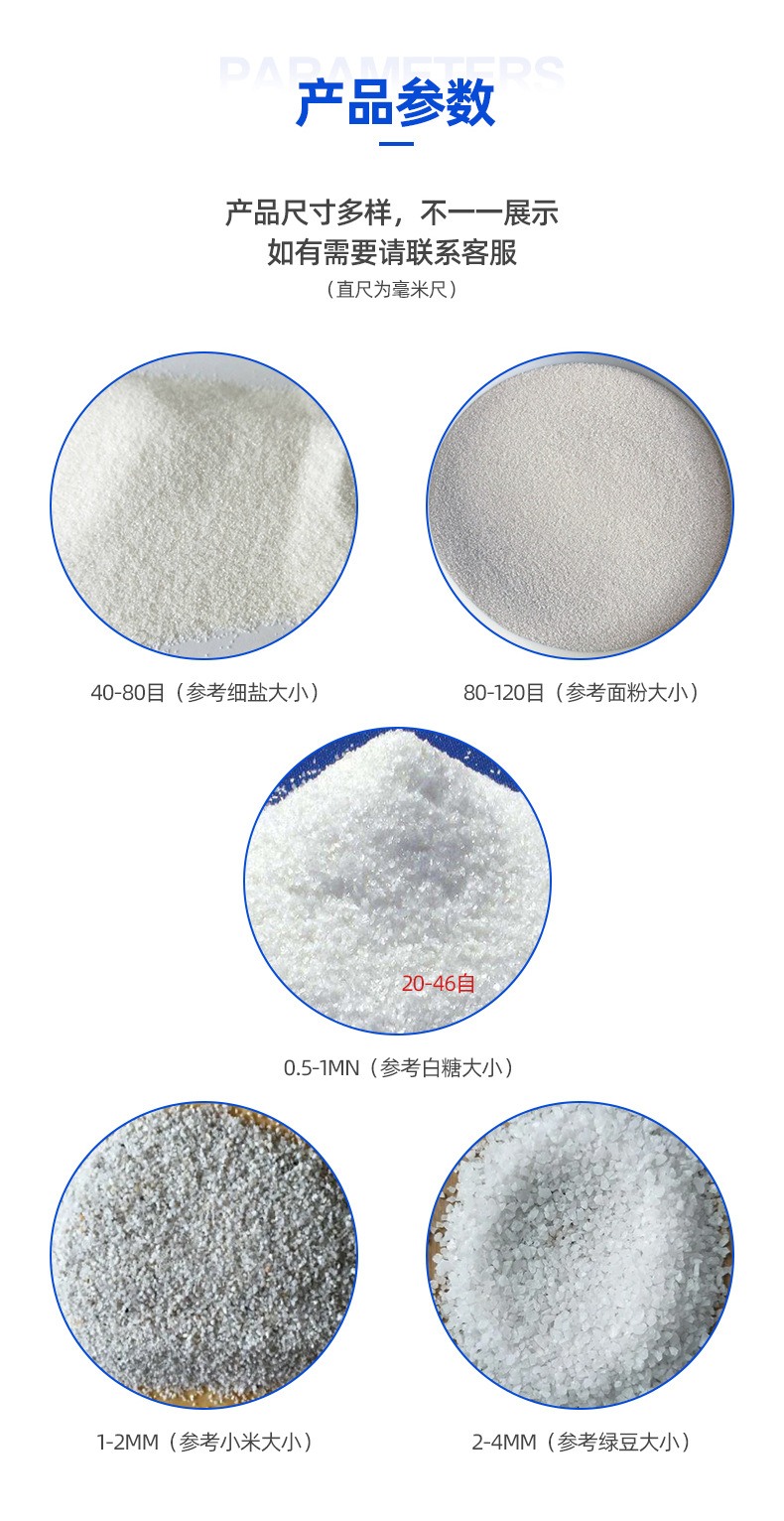 石英砂常用规格有:0.5-1mm、1-2mm、2-4mm、4-8mm、8-16mm、16-32mm、10-20目、20-40目、40-80目、100-120目。