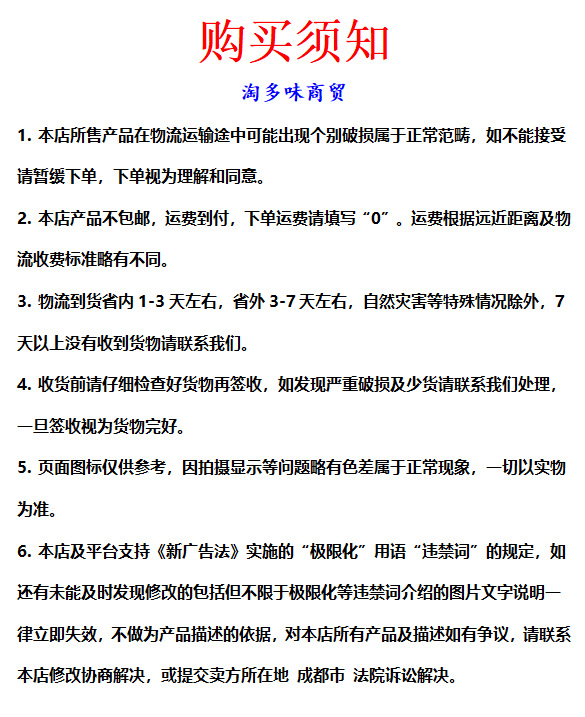 3.批发利润微薄所有产品均不包邮,默认发物流运费到付自提(物流只能到市区和县城物流指定的物流点,不能到乡镇),下单运费默认填0(了解运费请咨询客服)如需到乡镇请联系客服发快递(快递运费需要先付)