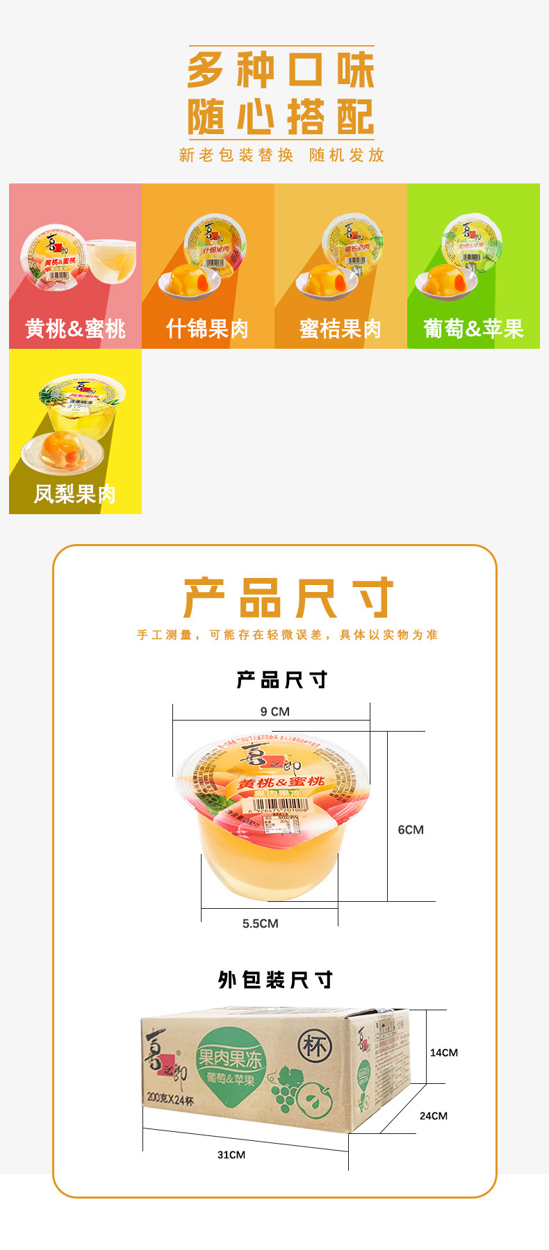 Номер товара Xizhilang jelly 200g cup (assorted flavors, yellow peach + peach, tangerine flavor, grape + apple flavor, pineapple flavor)