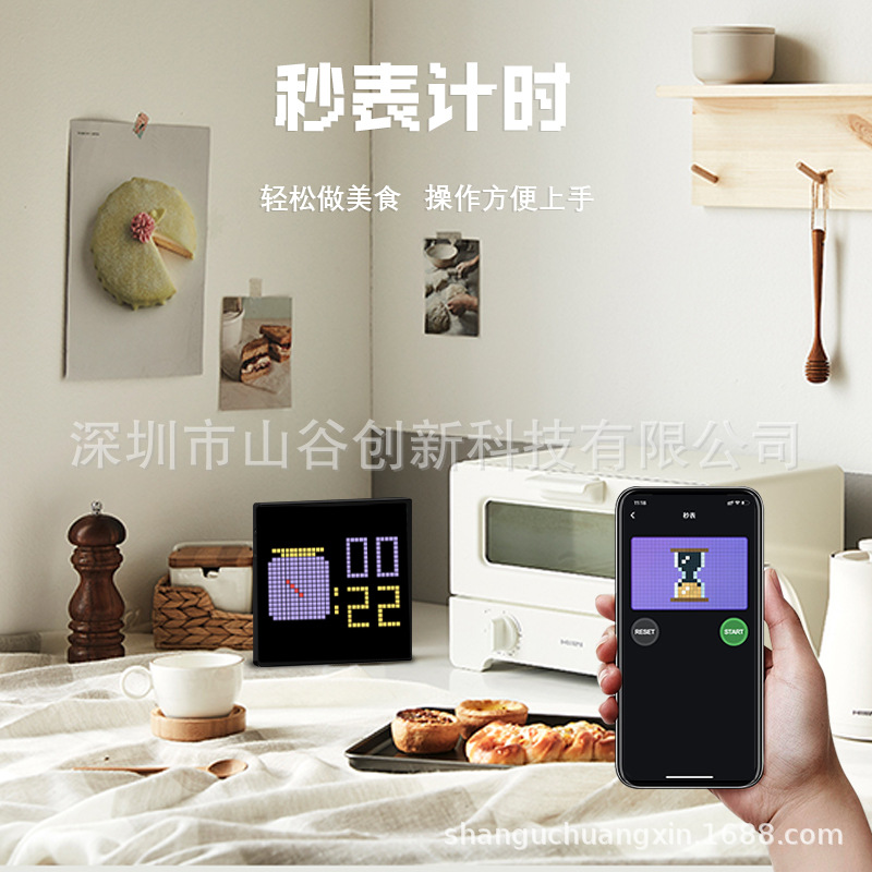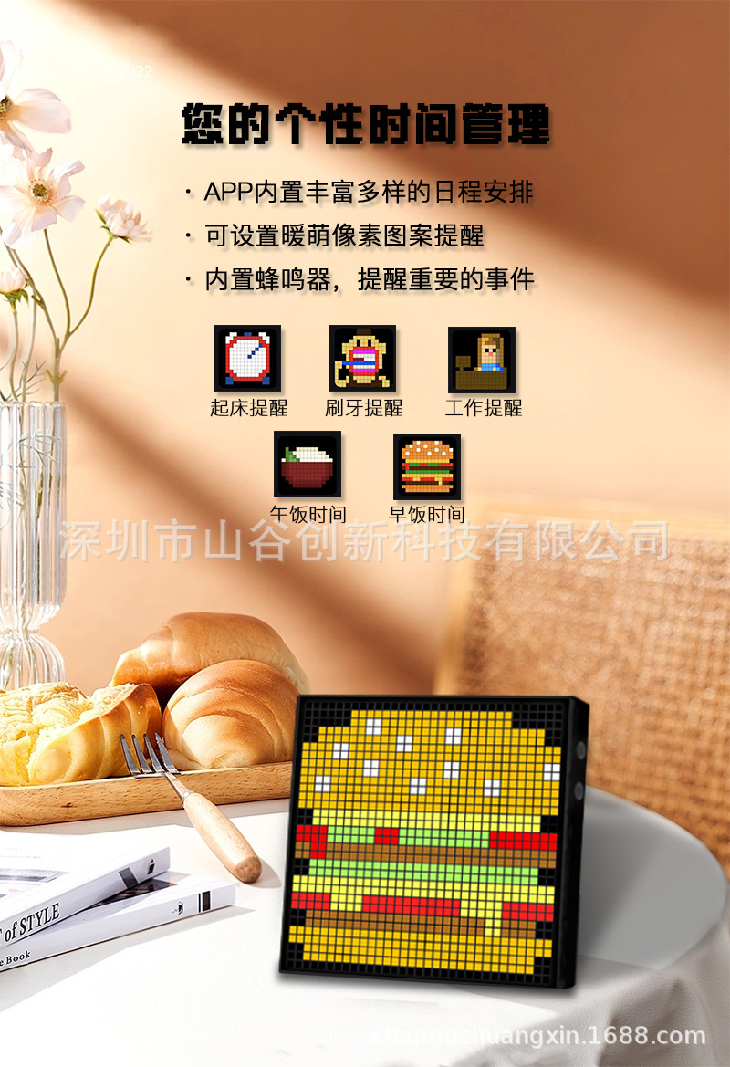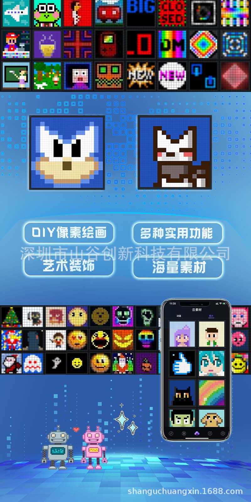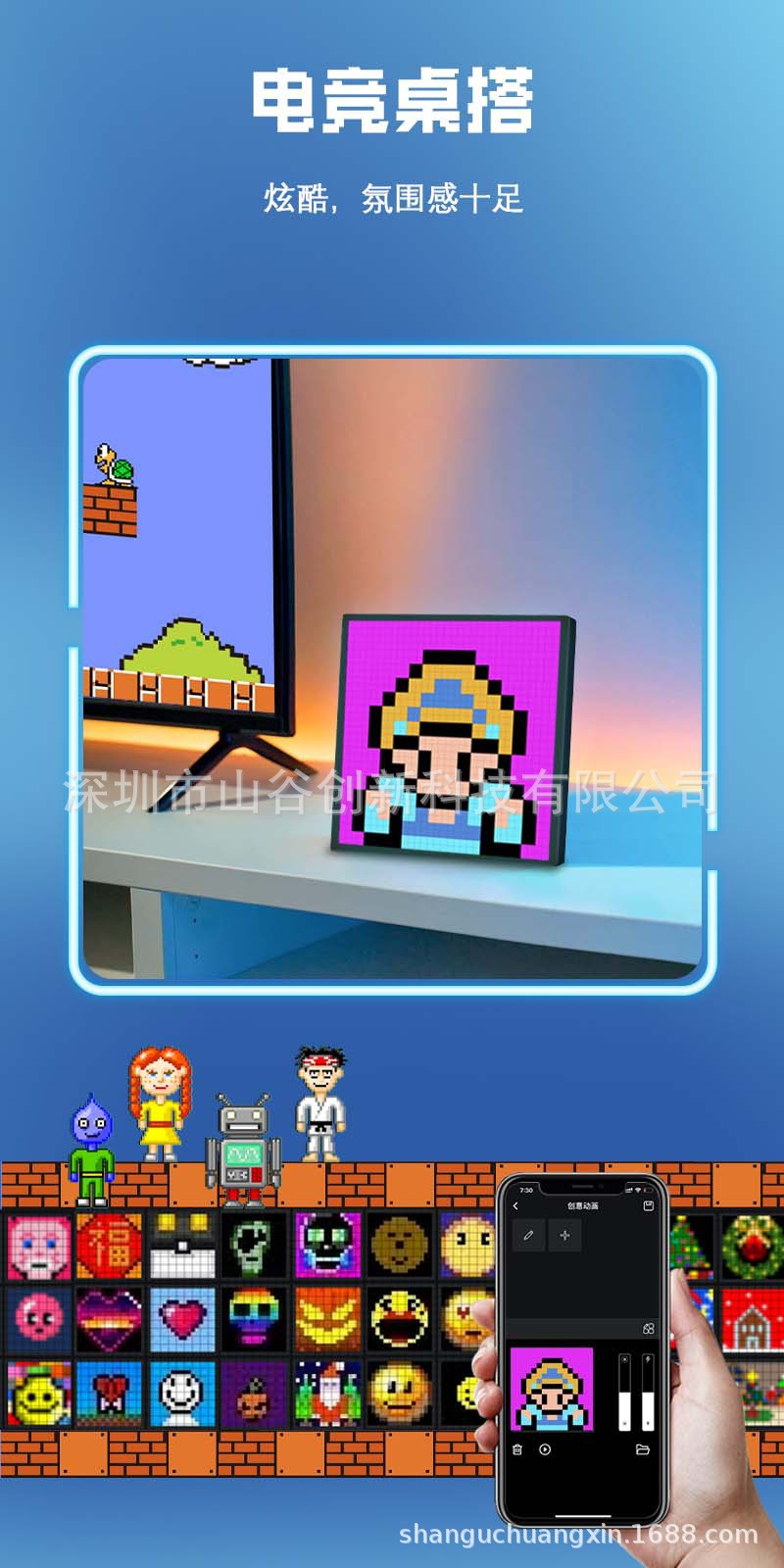 2023年新品上市:DIY马赛克像素风画框,内置多种动画场景素材,有DIY涂鸦,智能闹钟,倒计时,比赛计分板,智能时钟,日程安排,秒表,预设短语,文字,动画,音乐律动,支持多国语言等,APP功能强大稳定,实时发送,一键切换,海量云素材应有尽有免费使用,蓝牙连接,操作便捷!它既是一台科技潮物更是可玩性超强的氛围灯,年轻时尚潮流风向标!