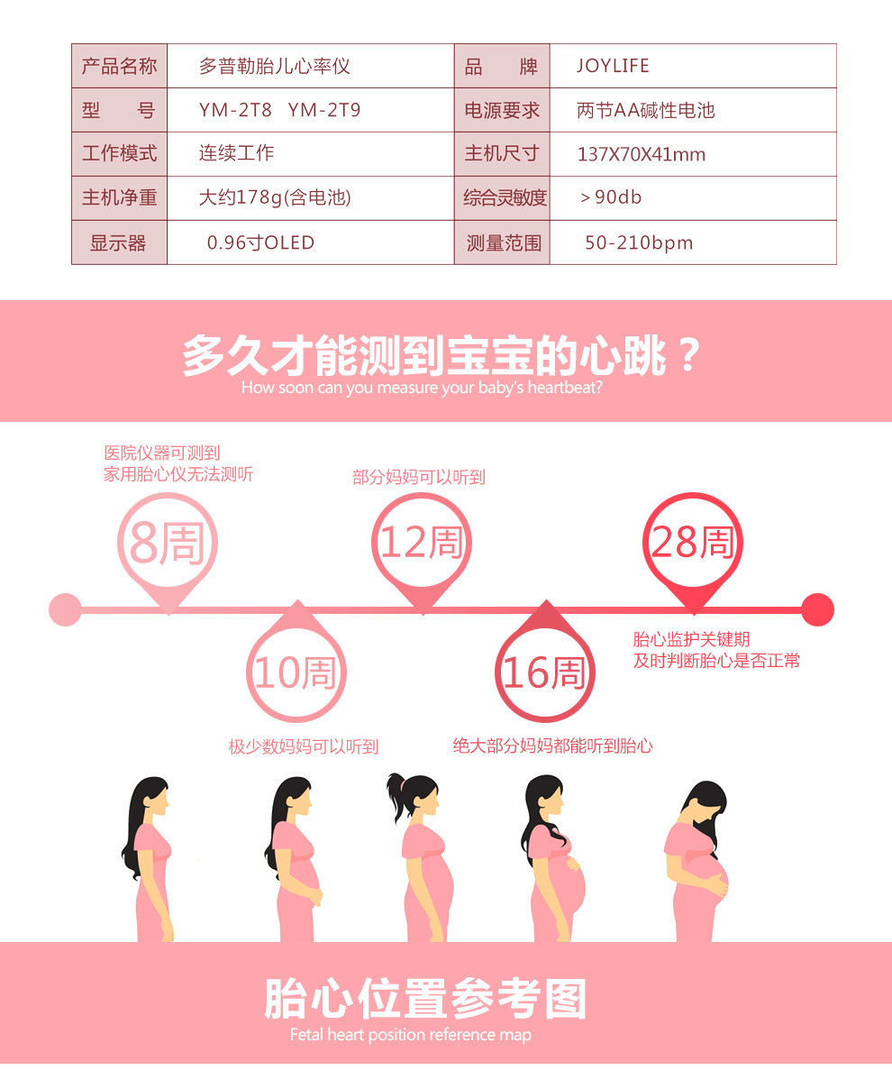 8、脉冲超声多普勒工作方式,单晶片高灵敏度探头,2MHz工作频率,超声剂量远低于标准,监护胎儿