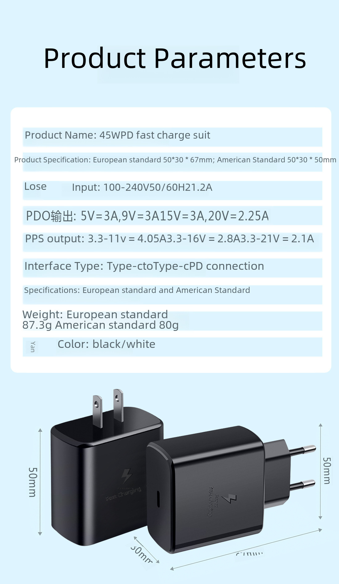 ![]() | Black european standard head + 3m wire opp bag packaging | 45W Super flash charger | ¥14.1 / ≈ 170 ₽ | 88886 | 5891201745672 | |