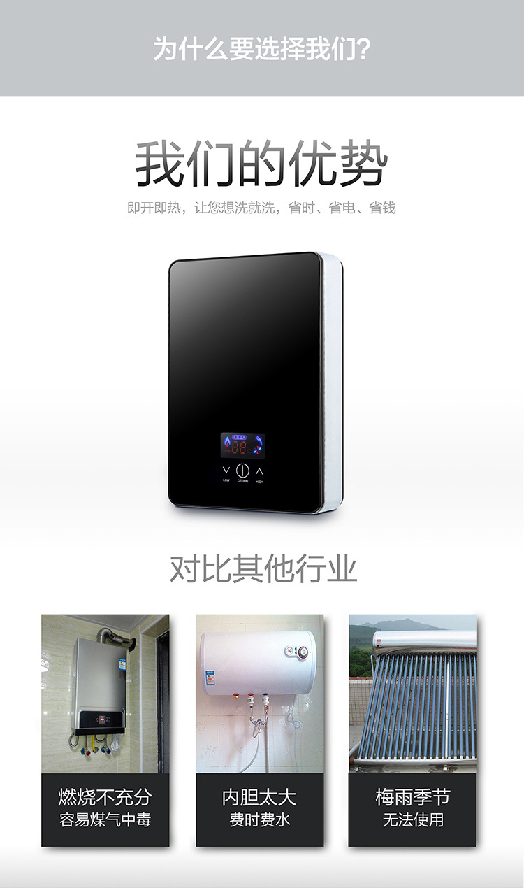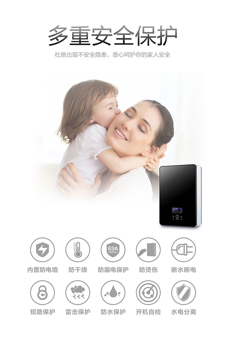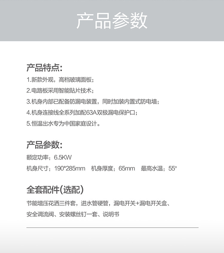 【温馨提示】亲,即热式电热水器8500W对安装线路要求比较高,请购买之前先确认好线路是否为≥4平方毫米的铜线,开关是否≥40A(安),6500W要求2.5平方铜线,开关是否≥30A(安).