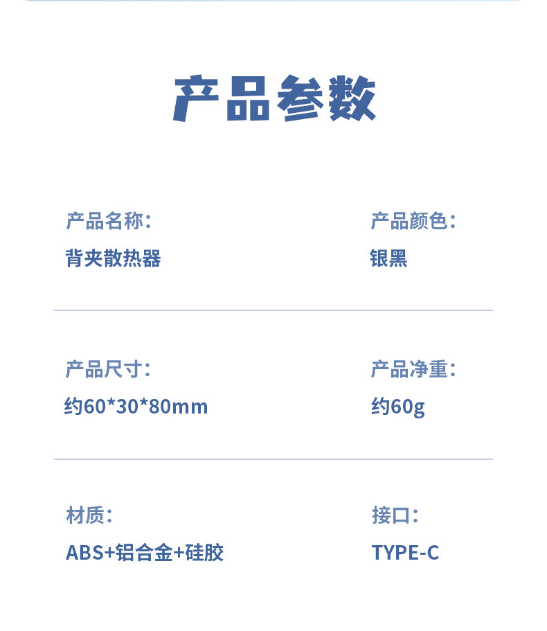 包装配件:散热器*,背夹,1米3A Type-C线,说明书,引磁片,透明膜,毛刷